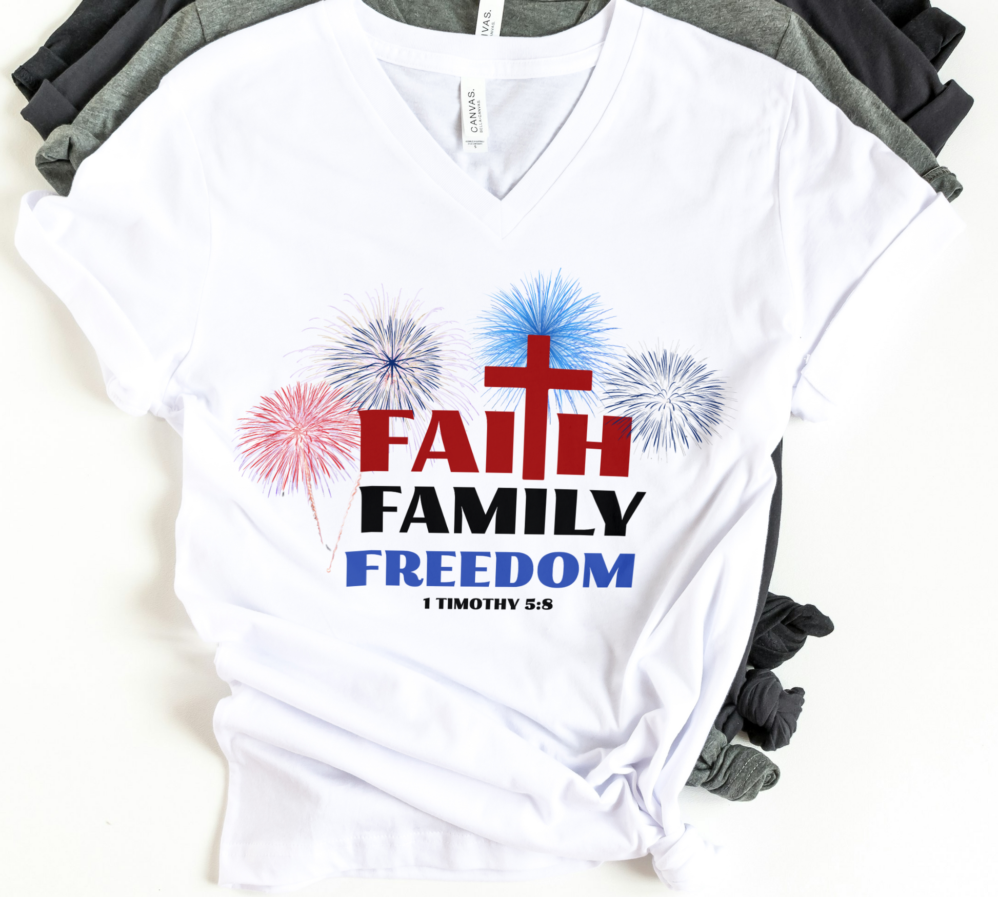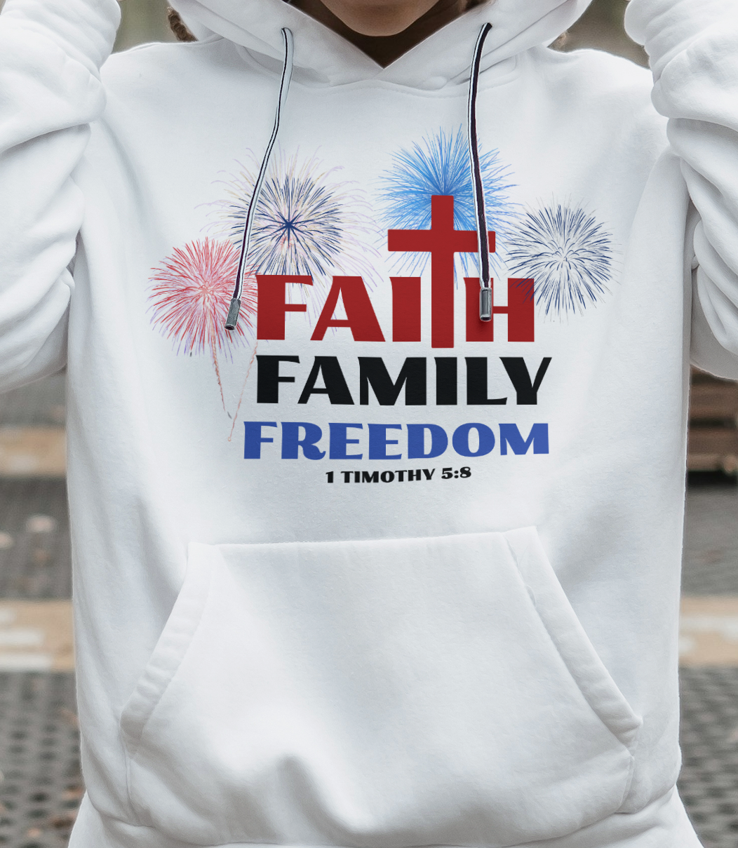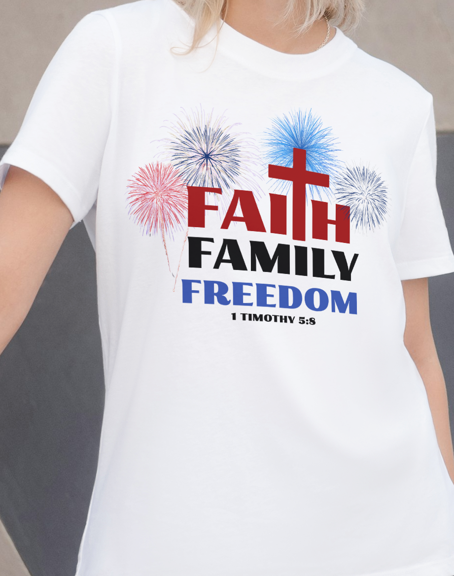 Faith is always first, family, freedom and fireworks. This simple but bold statement that God is first and family is so important. This design also features the sripture 1 Timothy 5:8 which says: But if anyone does not provide for his own, and especially for those of his household, he has denied the faith and is worse than an unbeliever.