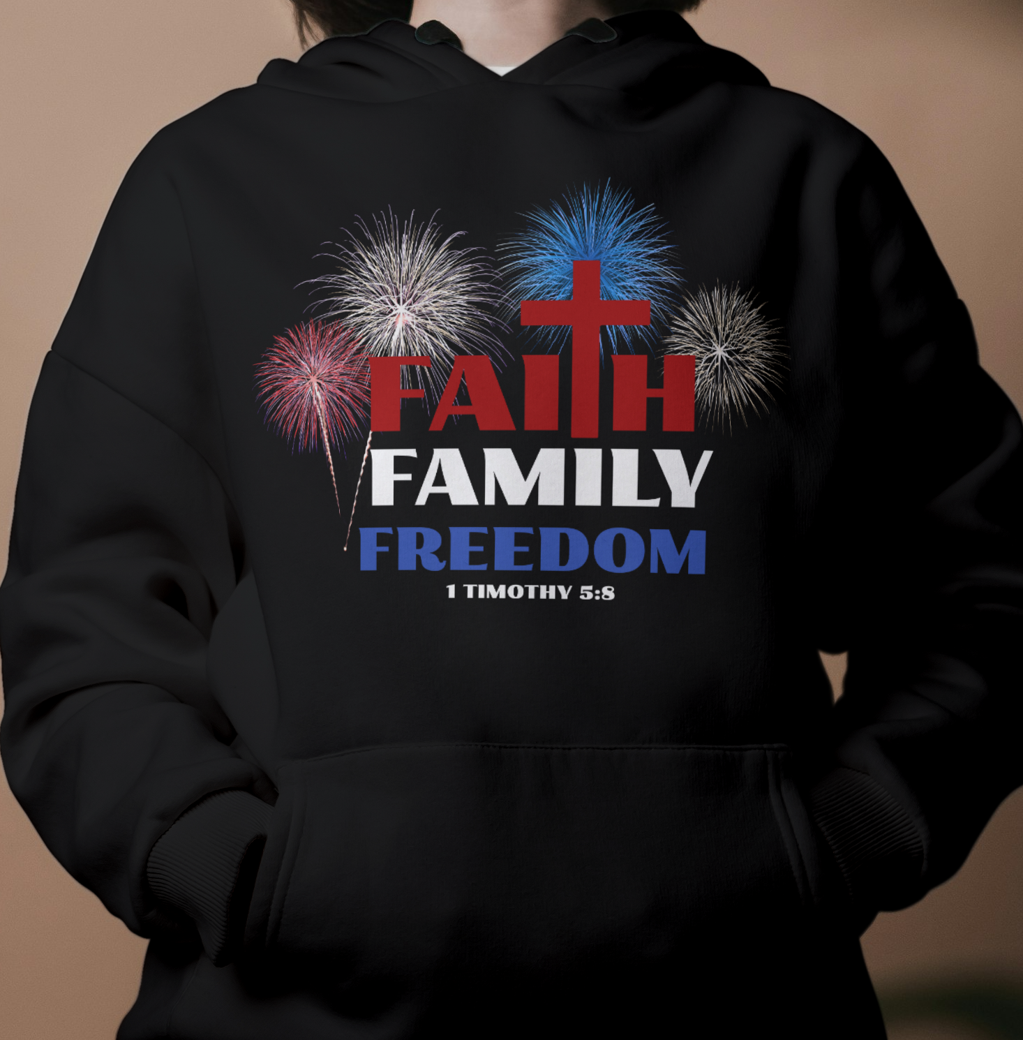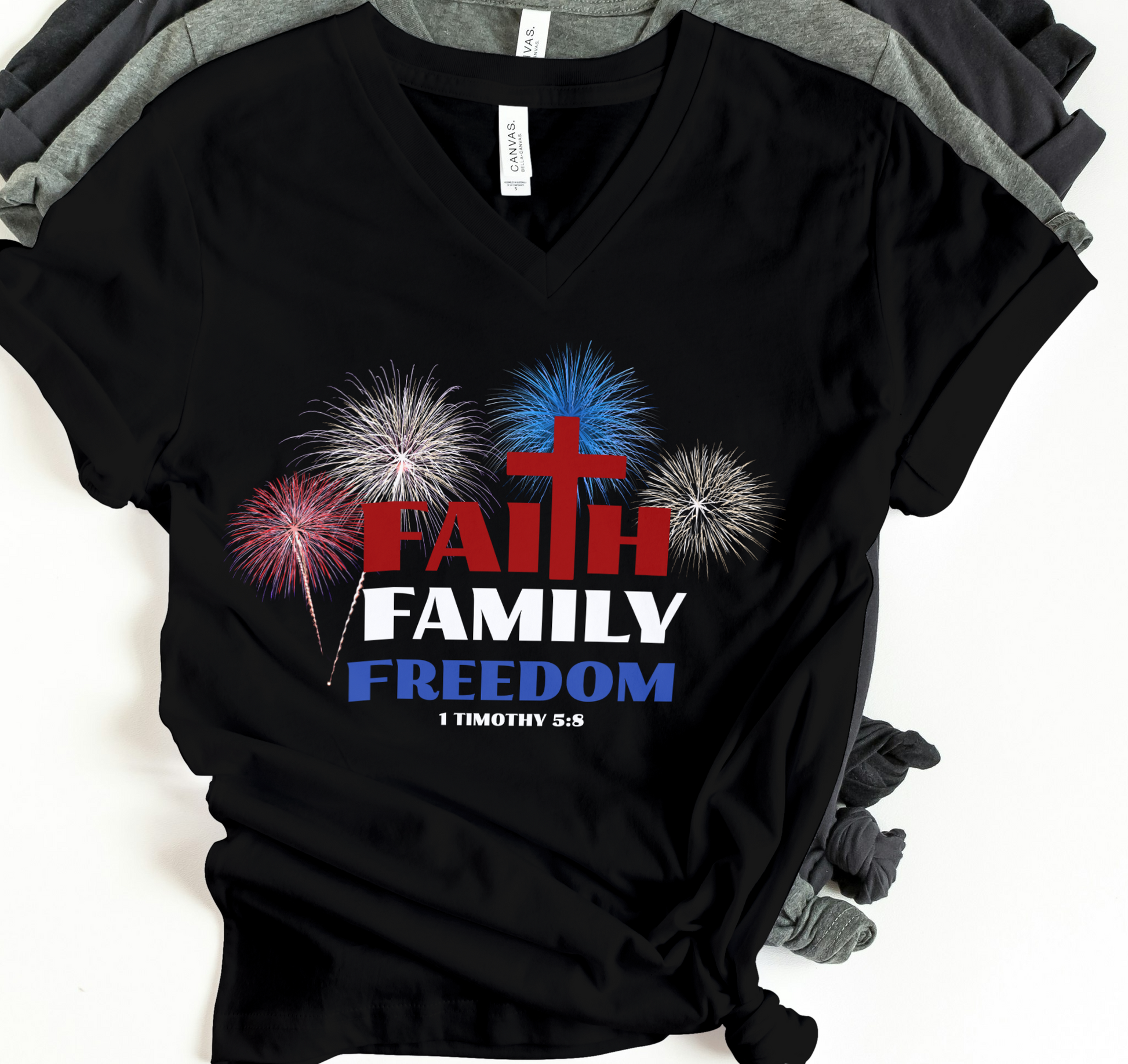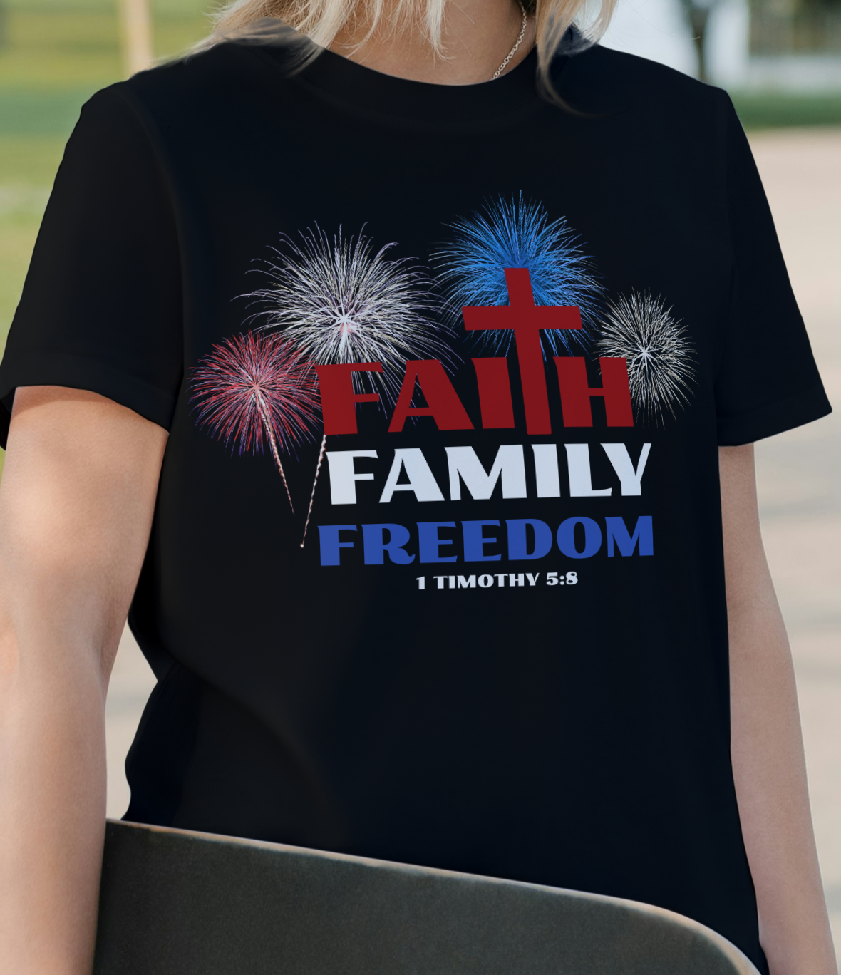 Faith is always first, family, freedom and fireworks. This simple but bold statement that God is first and family is so important. This design also features the sripture 1 Timothy 5:8 which says: But if anyone does not provide for his own, and especially for those of his household, he has denied the faith and is worse than an unbeliever.