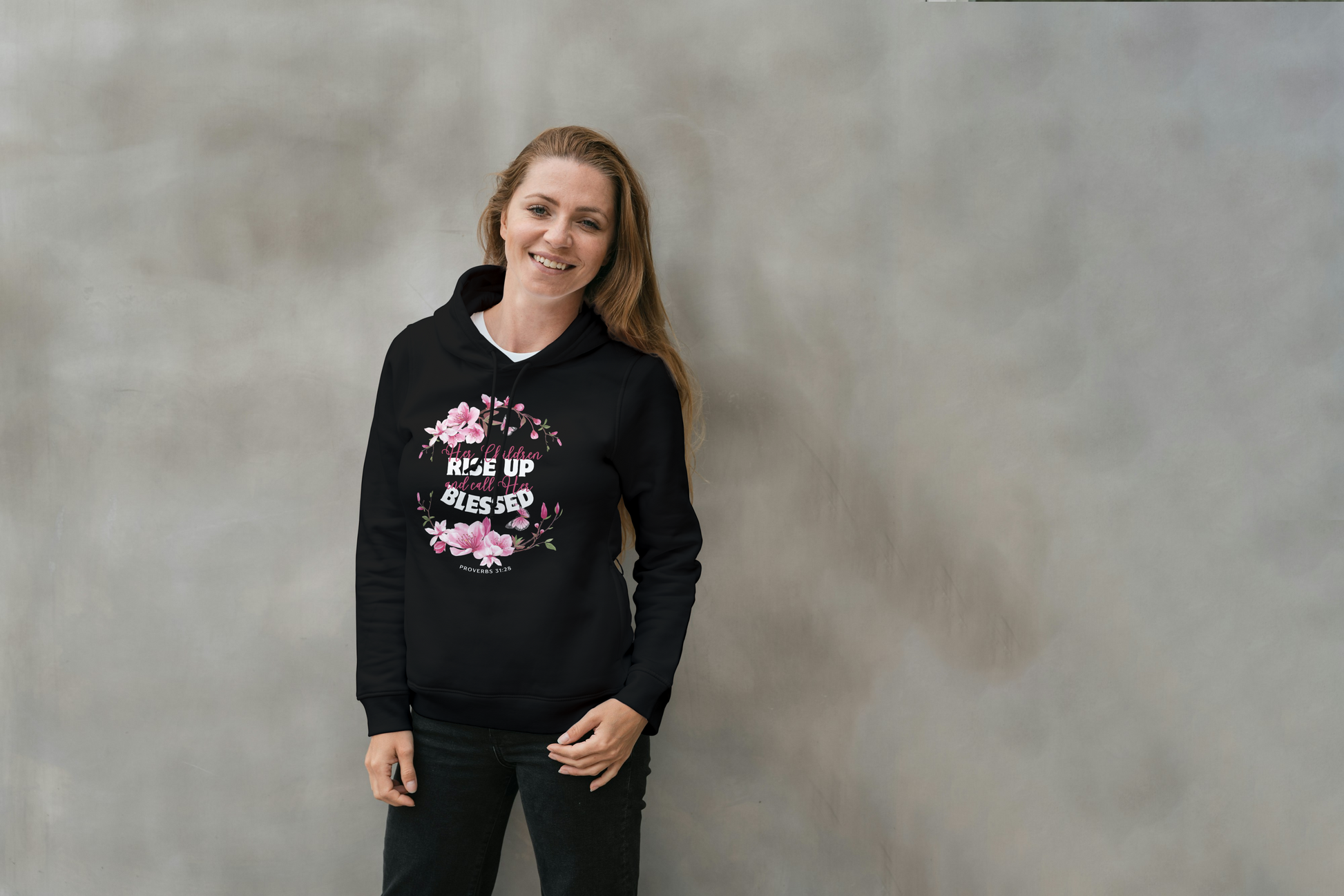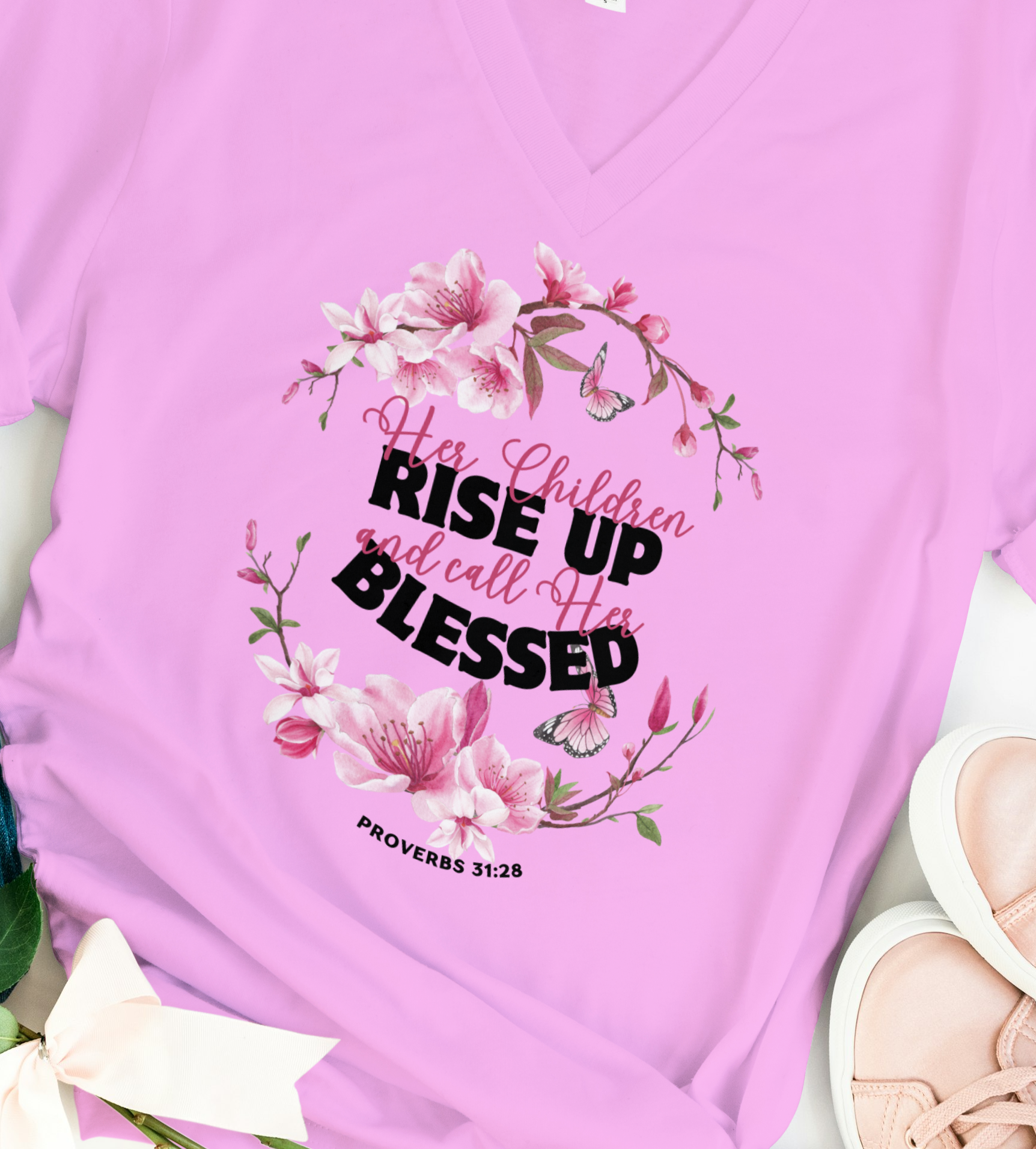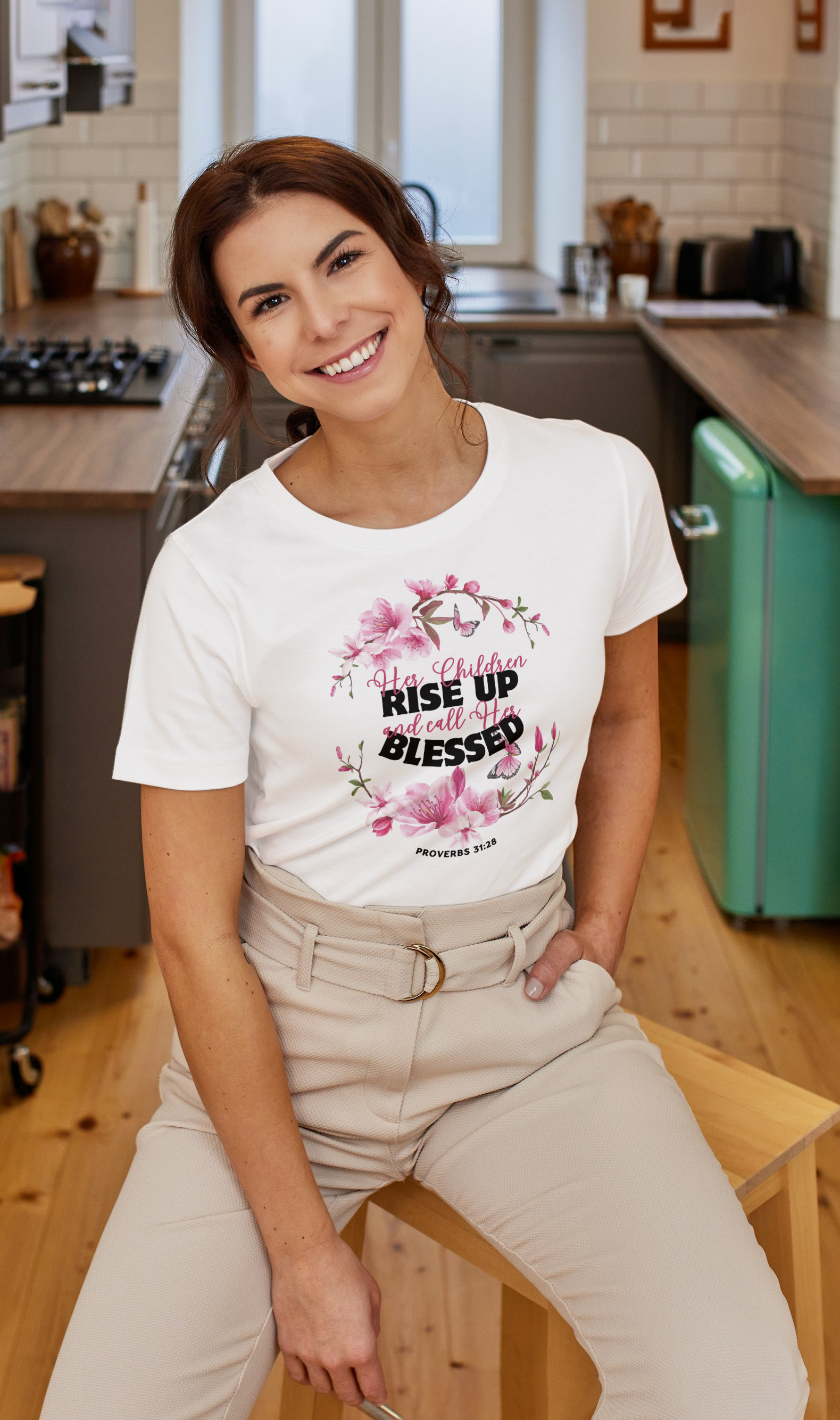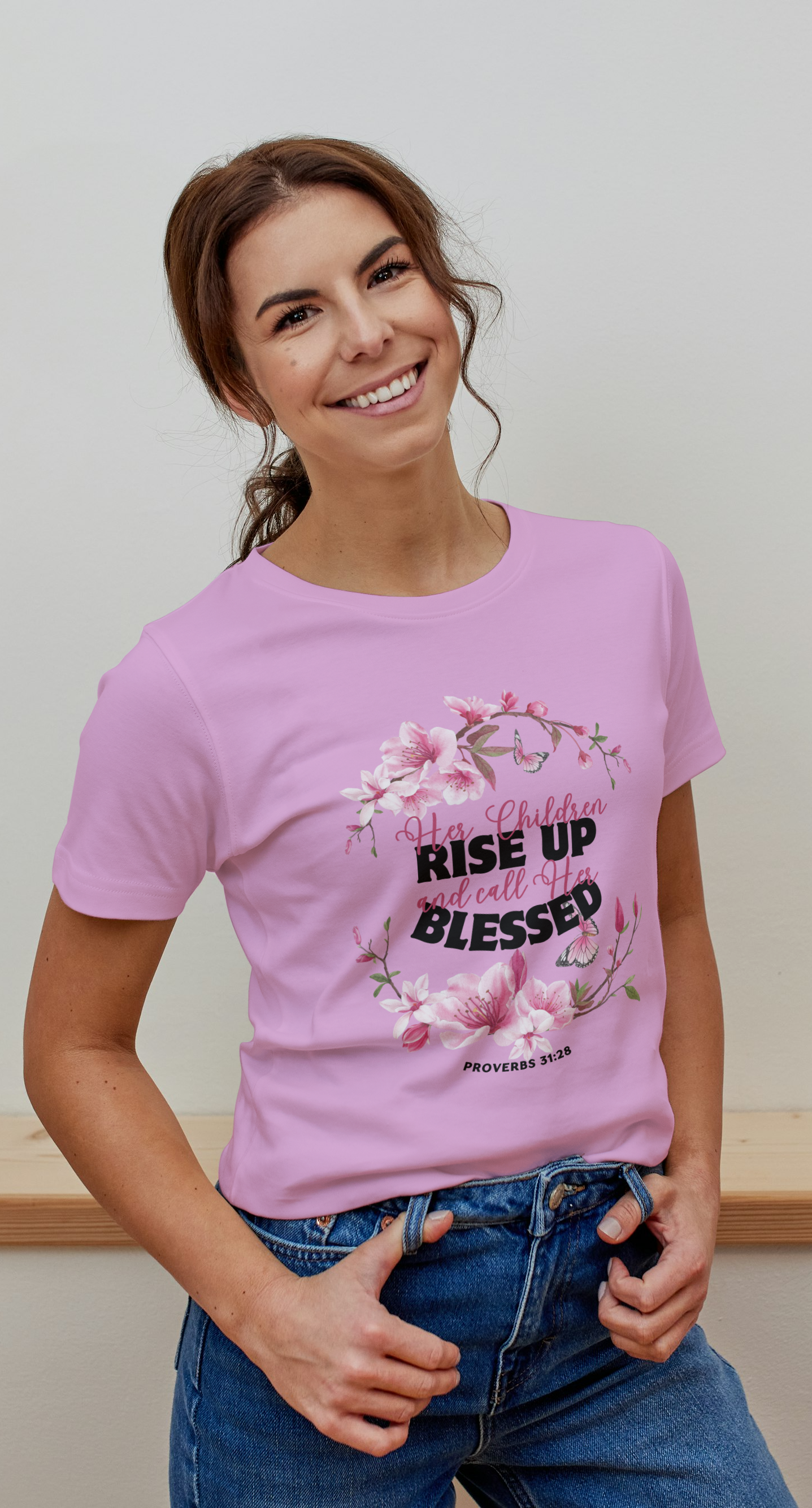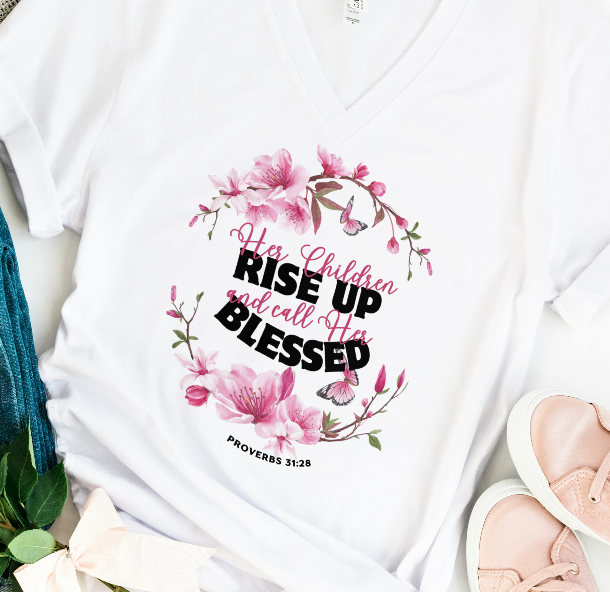 This is an eye catching floral desgin that features Proverbs 31:28. The scripture says; Her children rise up and call her blessed; Her husband also, and he praises her.