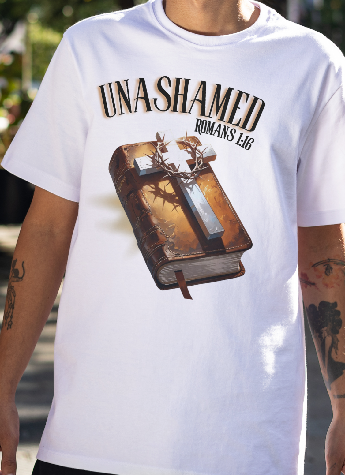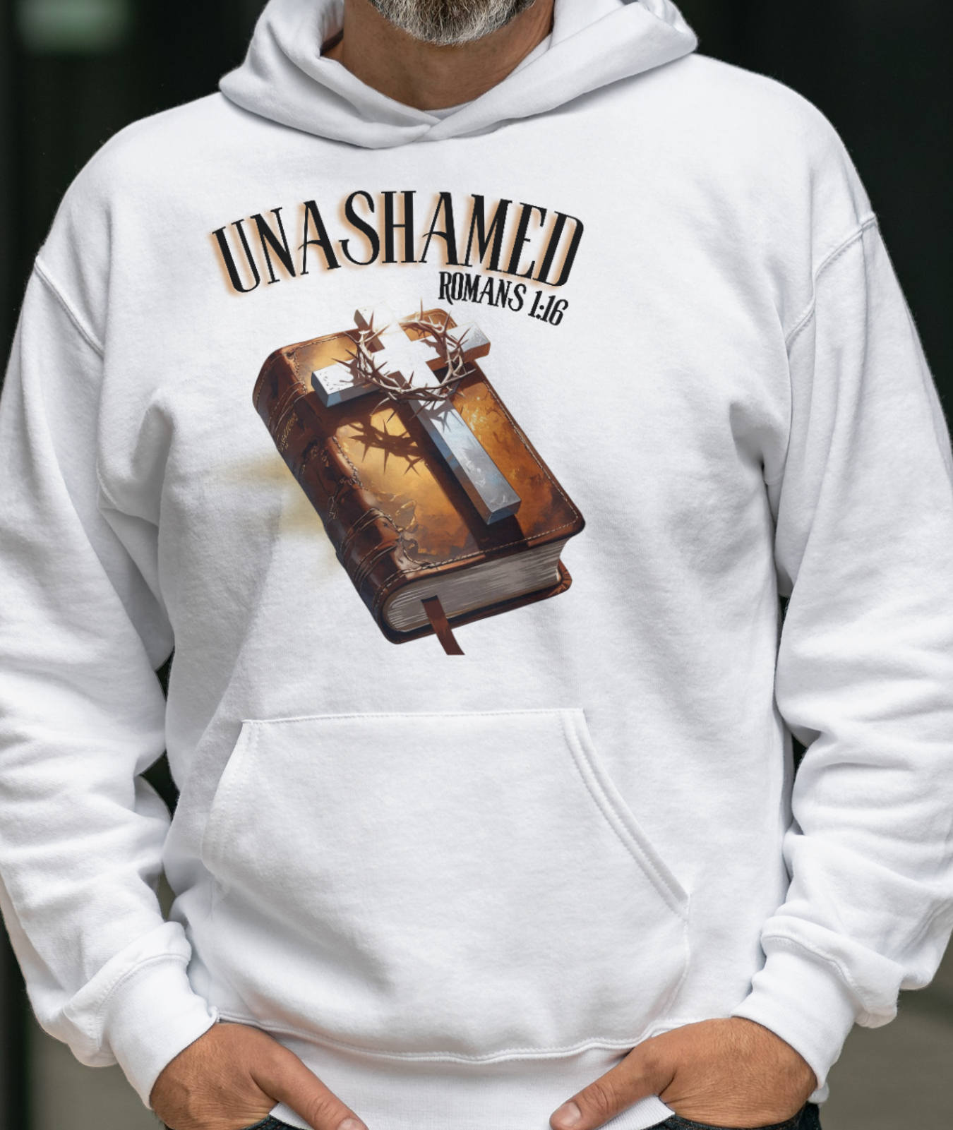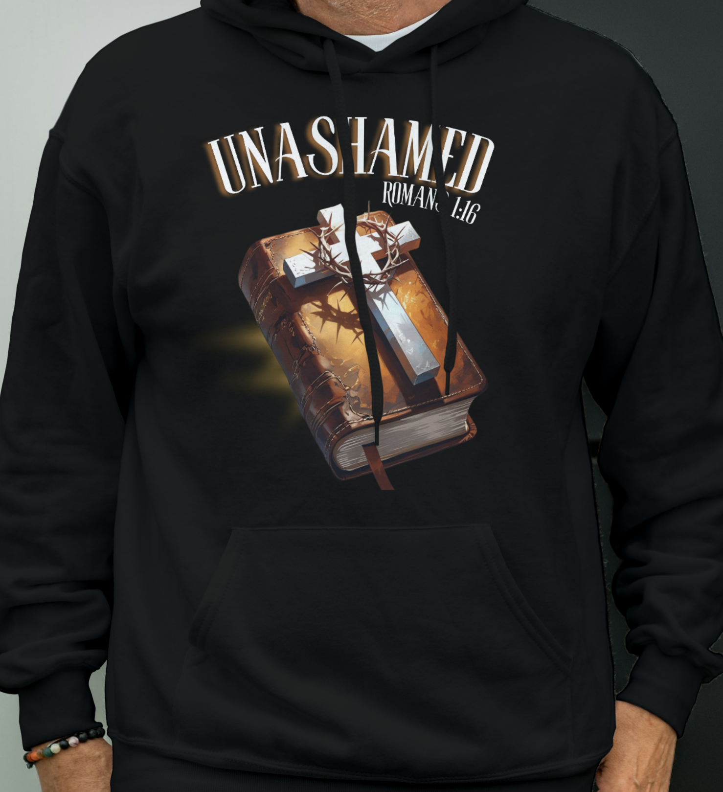 This design features a Bible with a cross and crown of thorns reminding us of Jesus' sacrifice. There is a glow representing the "Holy Spirit". It has Romans 1:16 which says: For I am not ashamed of the gospel of Christ, for it is the power of God to salvation for everyone who believes, for the Jew first and also for the Greek.