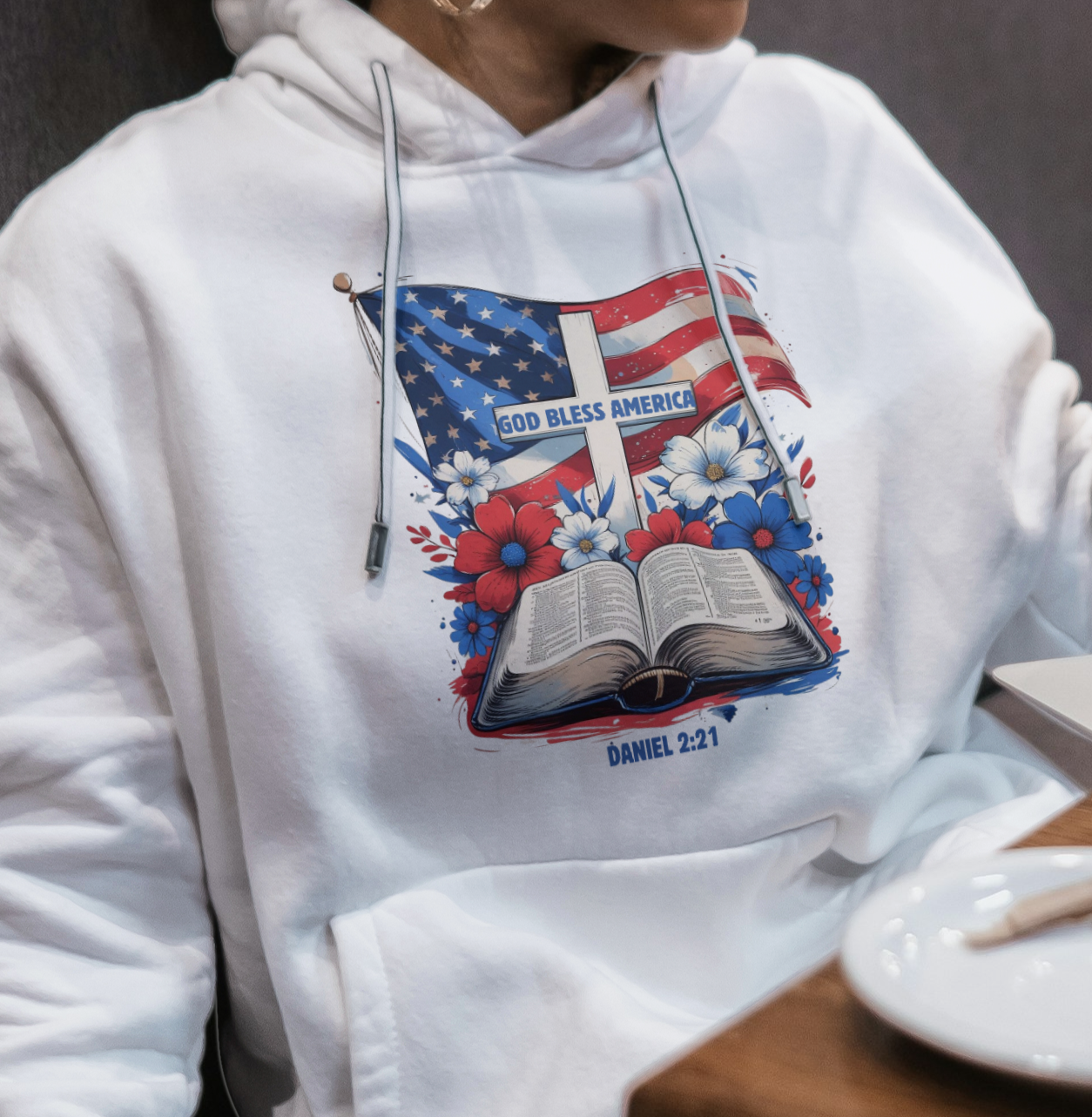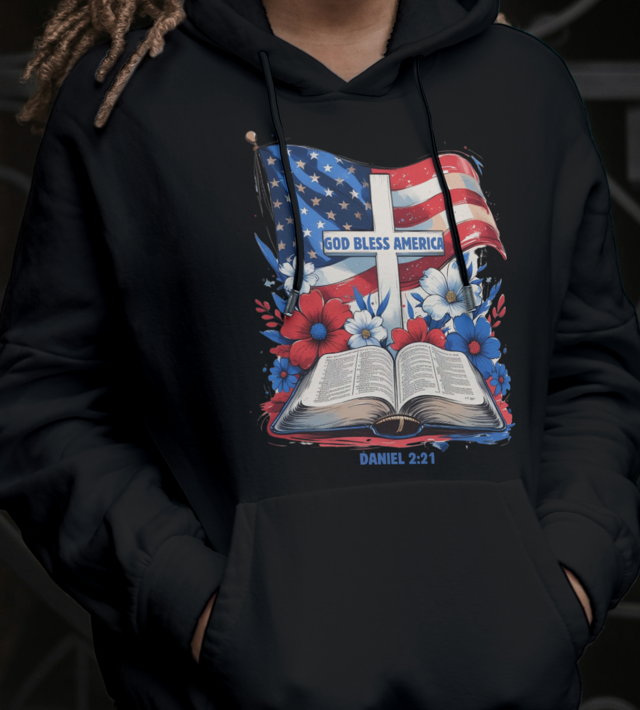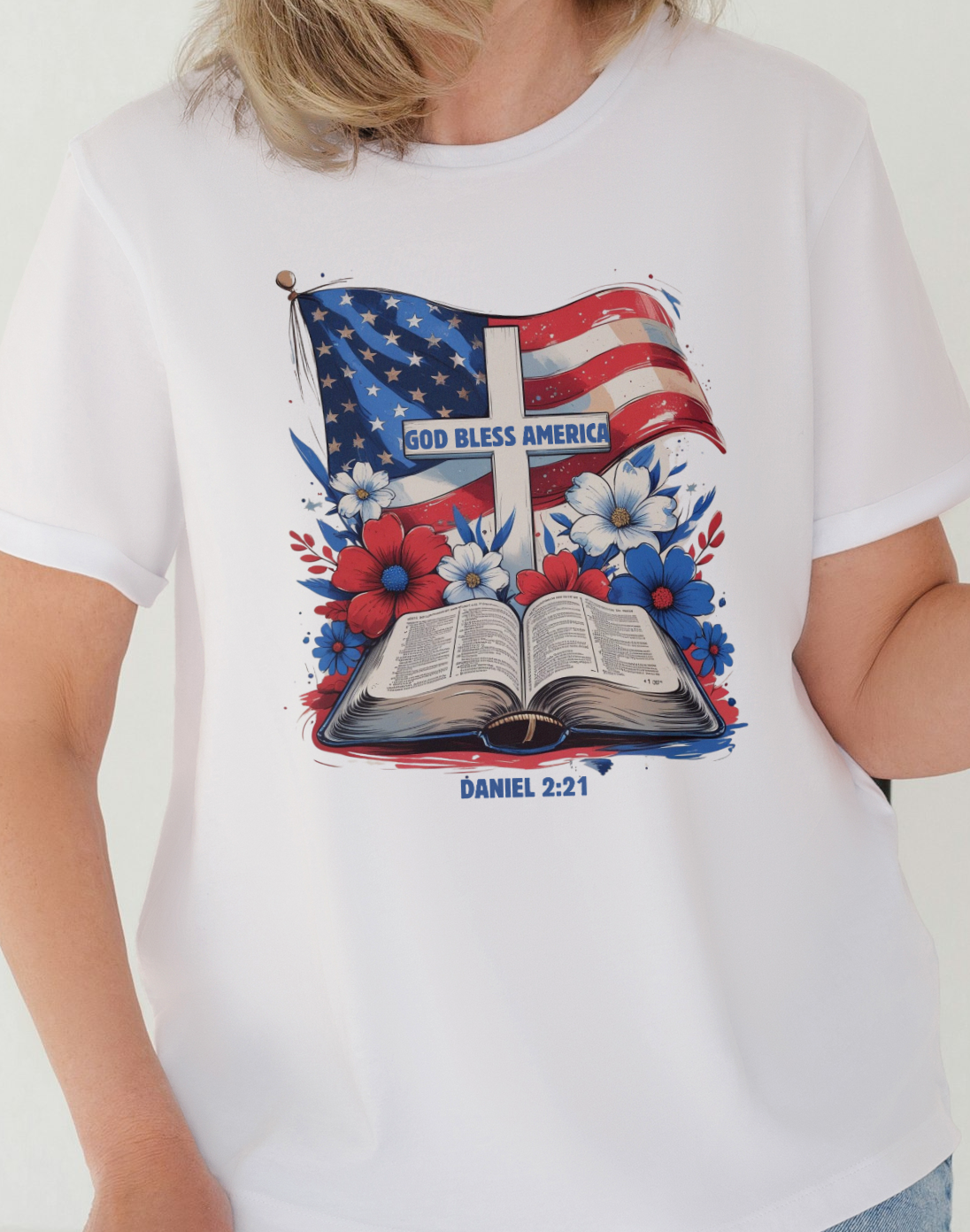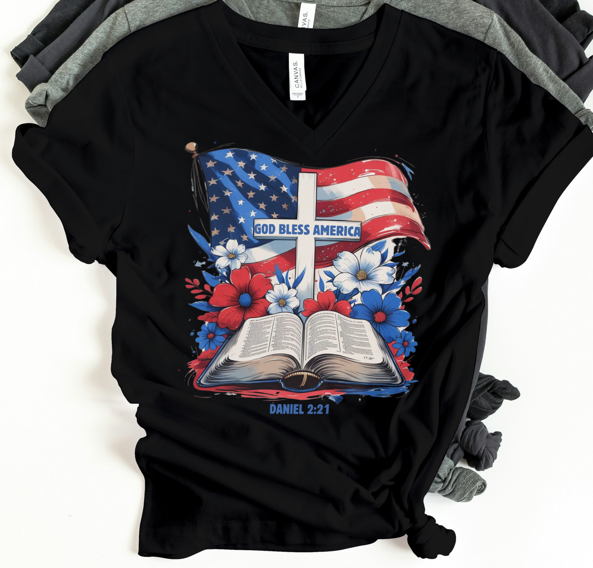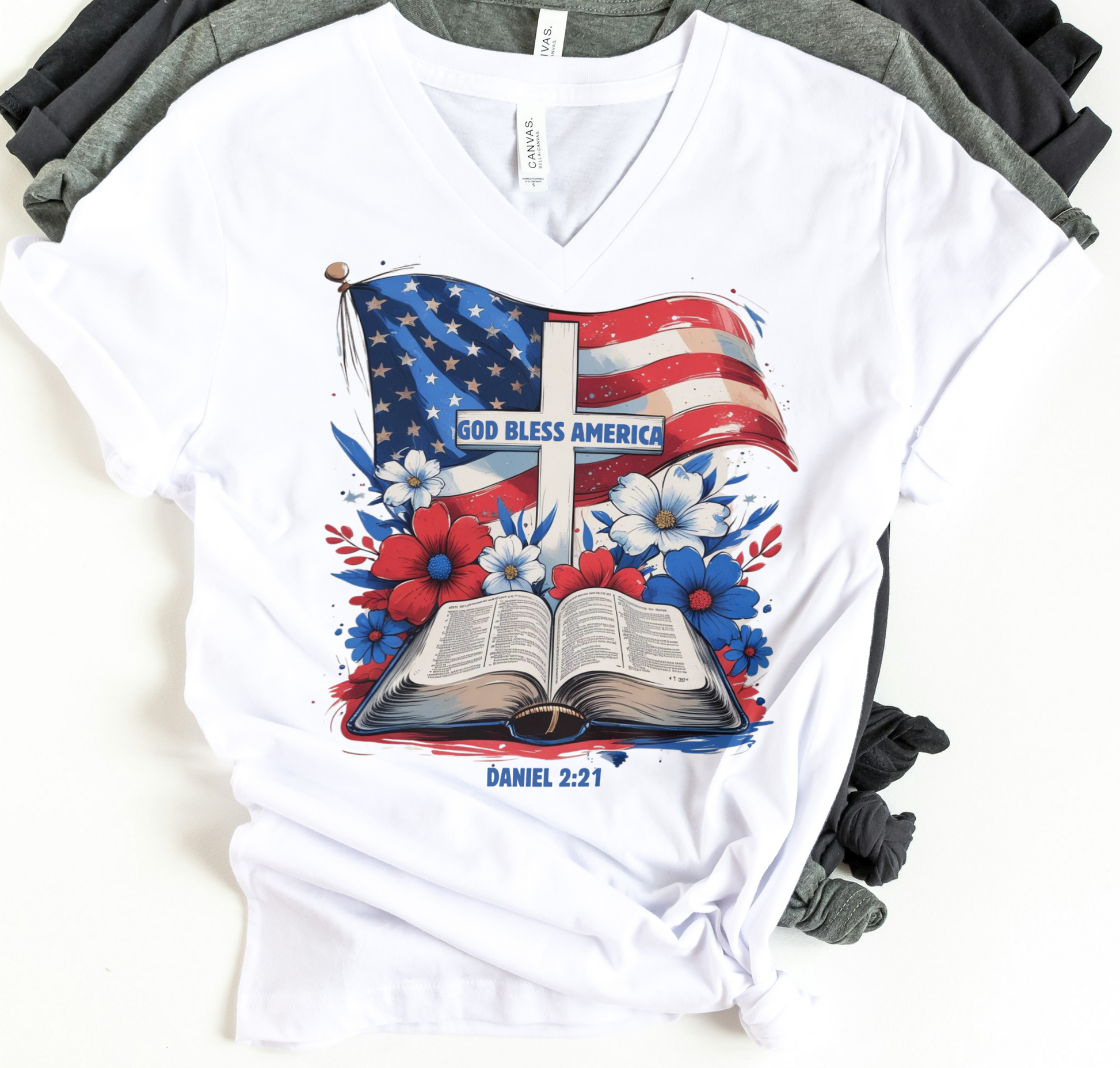 This is a beautiful red, white, and blue design with flowers, and an American flag, a cross, and a bible. This design also features the scripture Daniel 2:21 which says: And He changes the times and the seasons; He removes kings and raises up kings; He gives wisdom to the wise