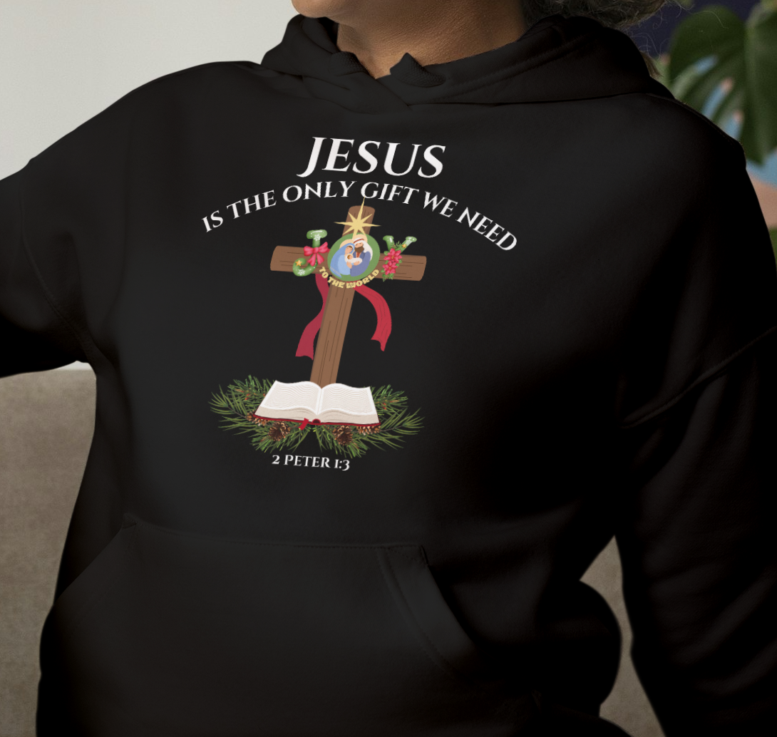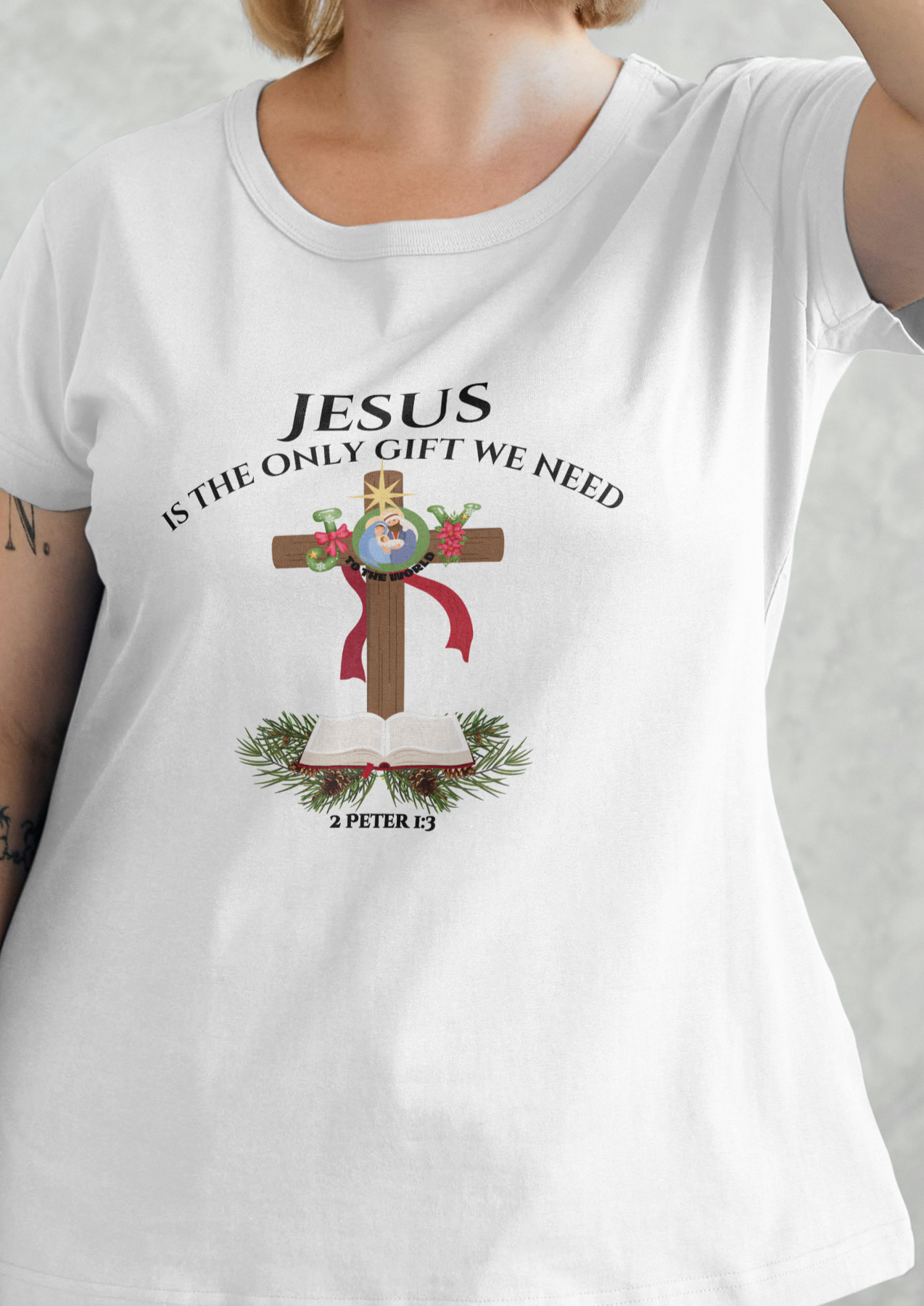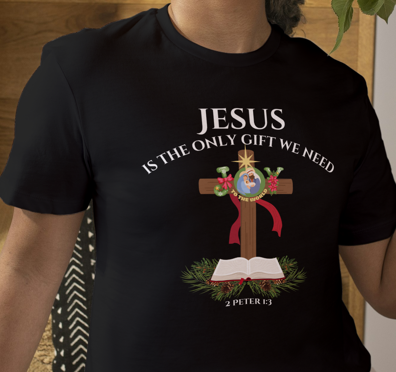 We don't need gifts in this world. Jesus Christ is the only gift we will ever need! This design features a cross, bible, joy to the world and a nativity scene with pine accents. And it had the scripture 2 Peter 1:3 which says: as His divine power has given to us all things that pertain to life and godliness, through the knowledge of Him who called us by glory and virtue. He gives us everything we will ever need!