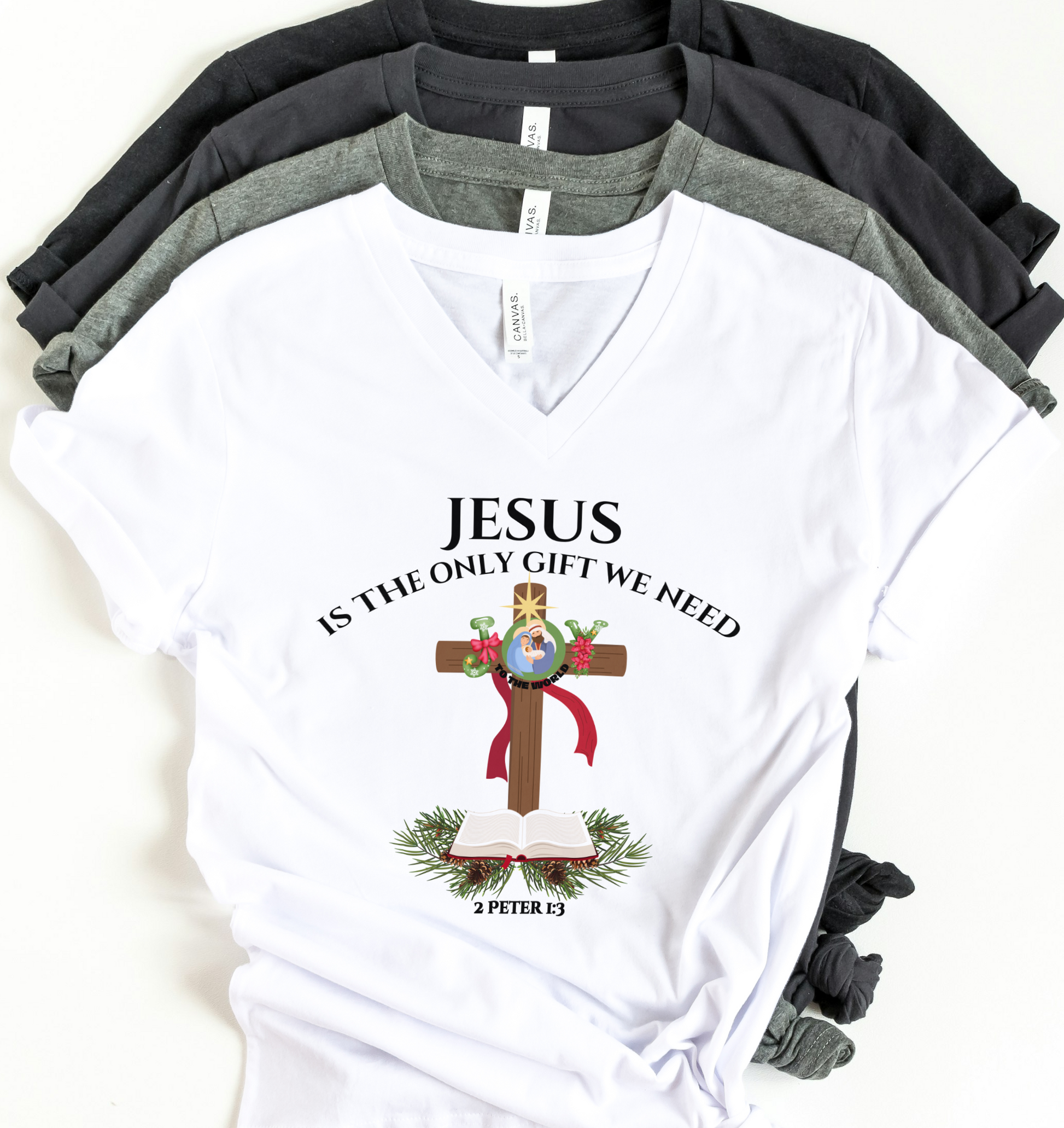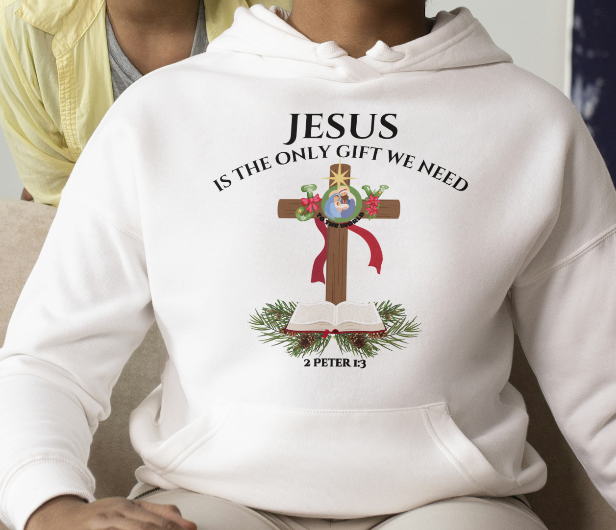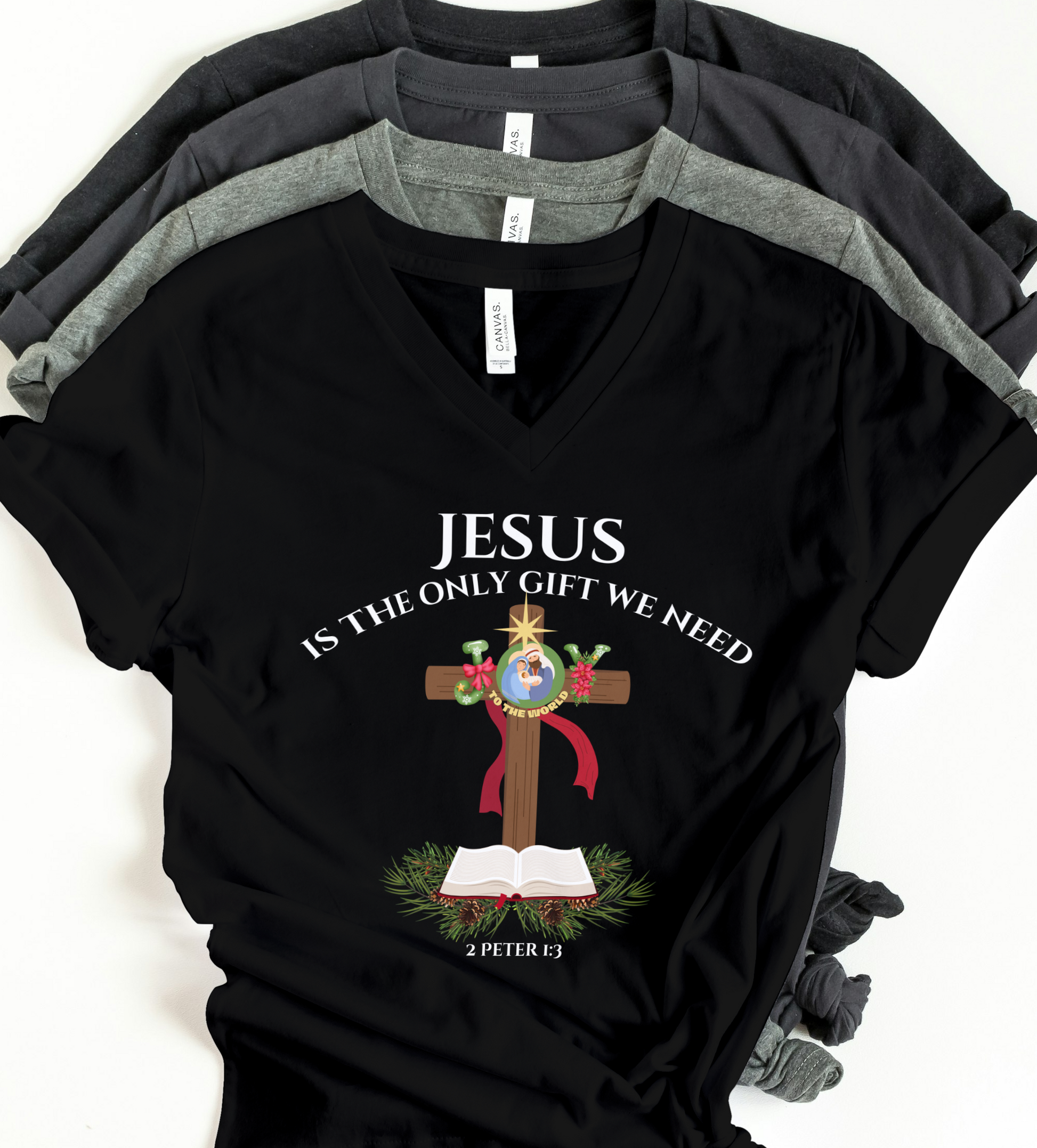 We don't need gifts in this world. Jesus Christ is the only gift we will ever need! This design features a cross, bible, joy to the world and a nativity scene with pine accents. And it had the scripture 2 Peter 1:3 which says: as His divine power has given to us all things that pertain to life and godliness, through the knowledge of Him who called us by glory and virtue. He gives us everything we will ever need!