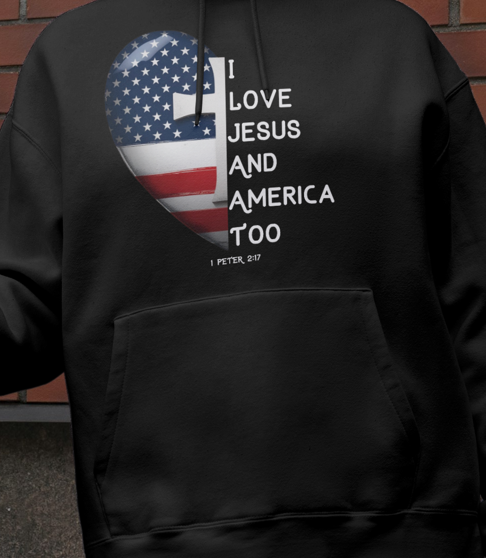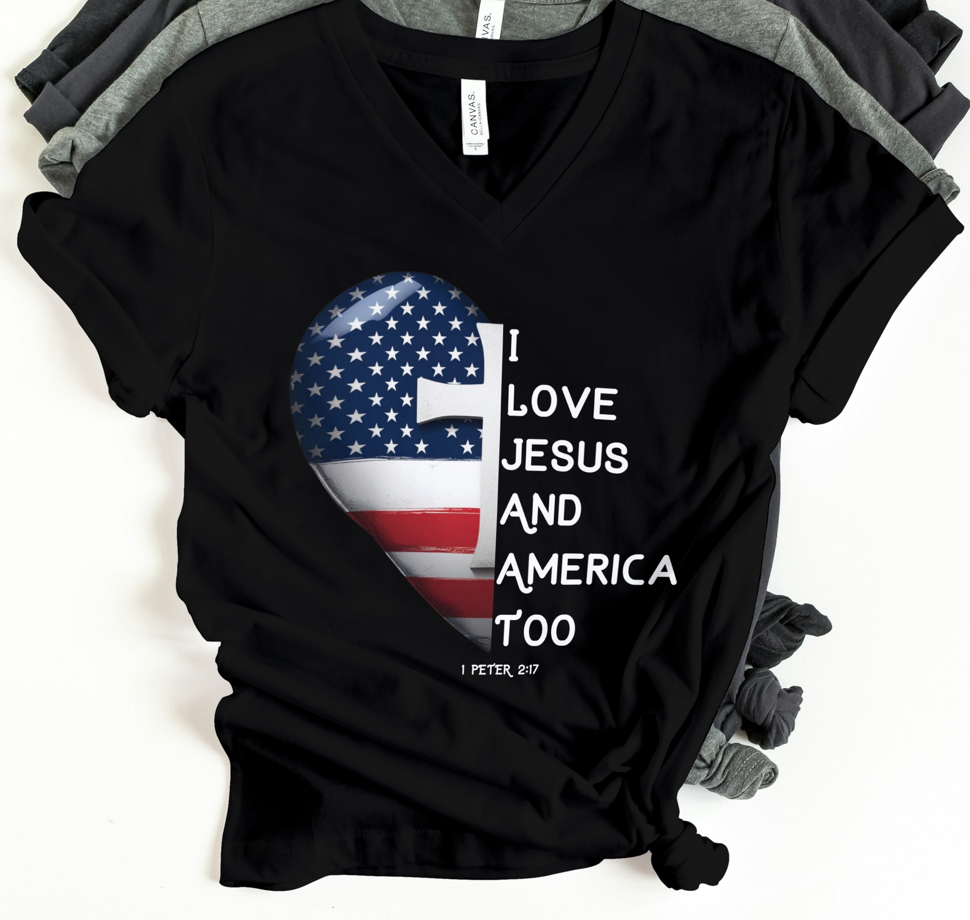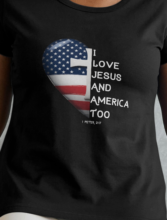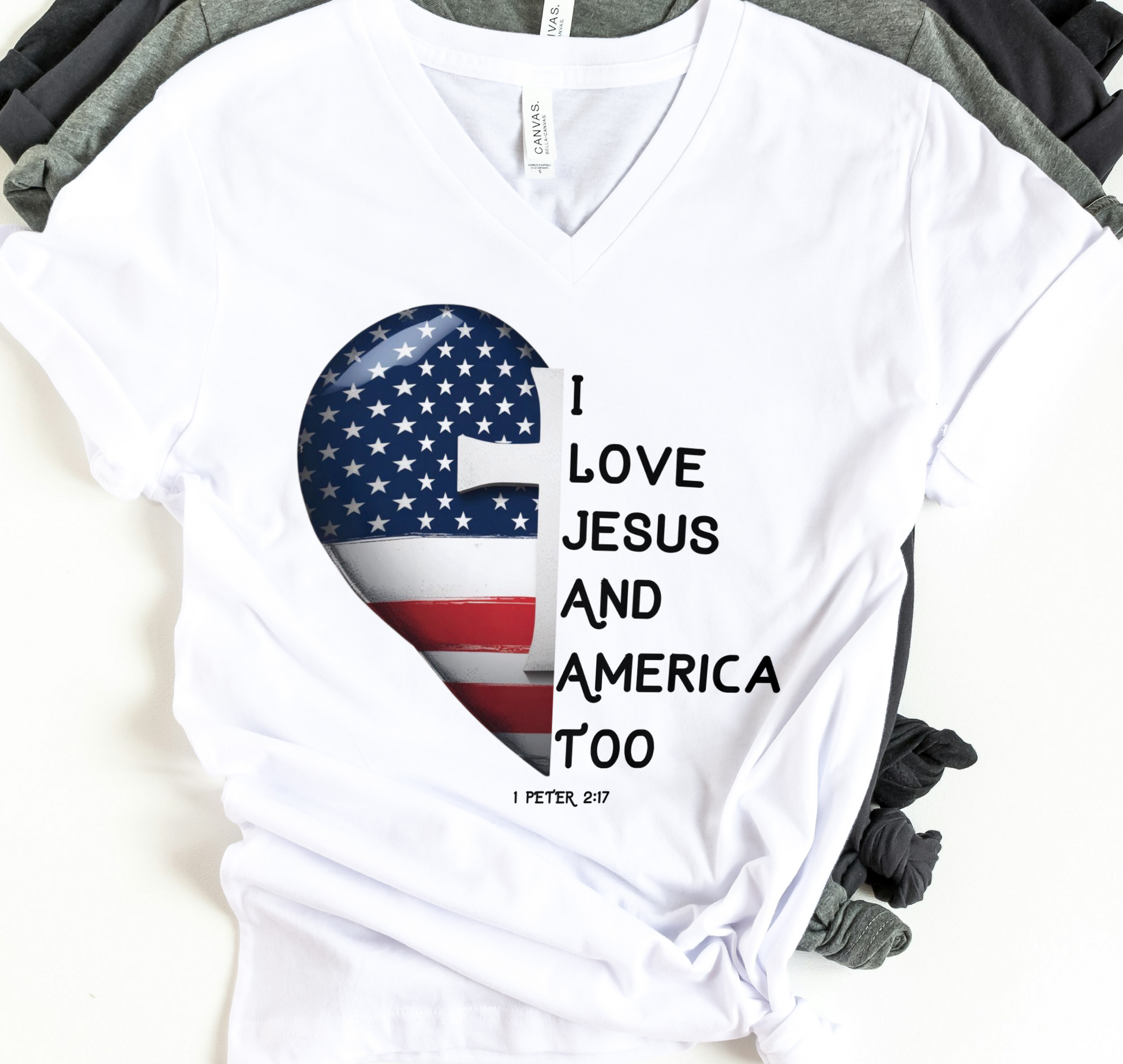 Half heart with American flag and cross and half words that say I love Jesus and America too. This design also features the sripture 1 Peter 2:17 which says: Honor all people. Love the brotherhood. Fear God. Honor the king.