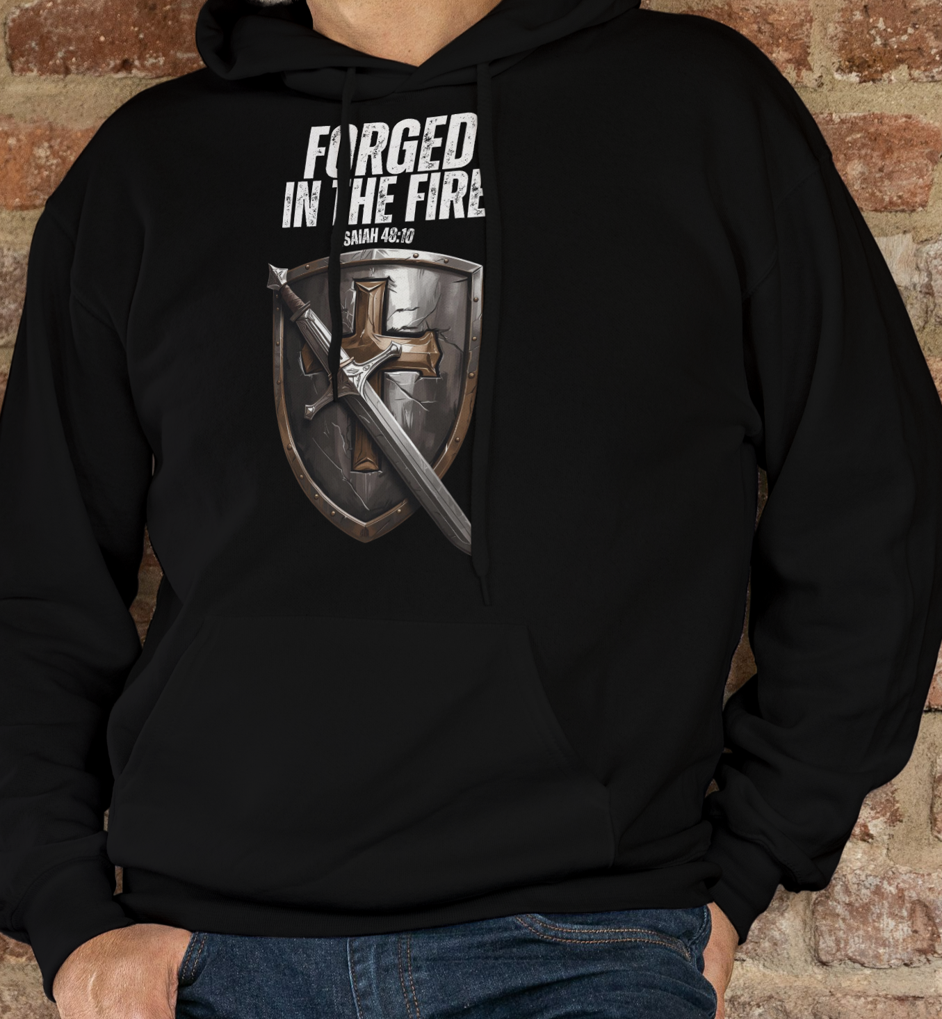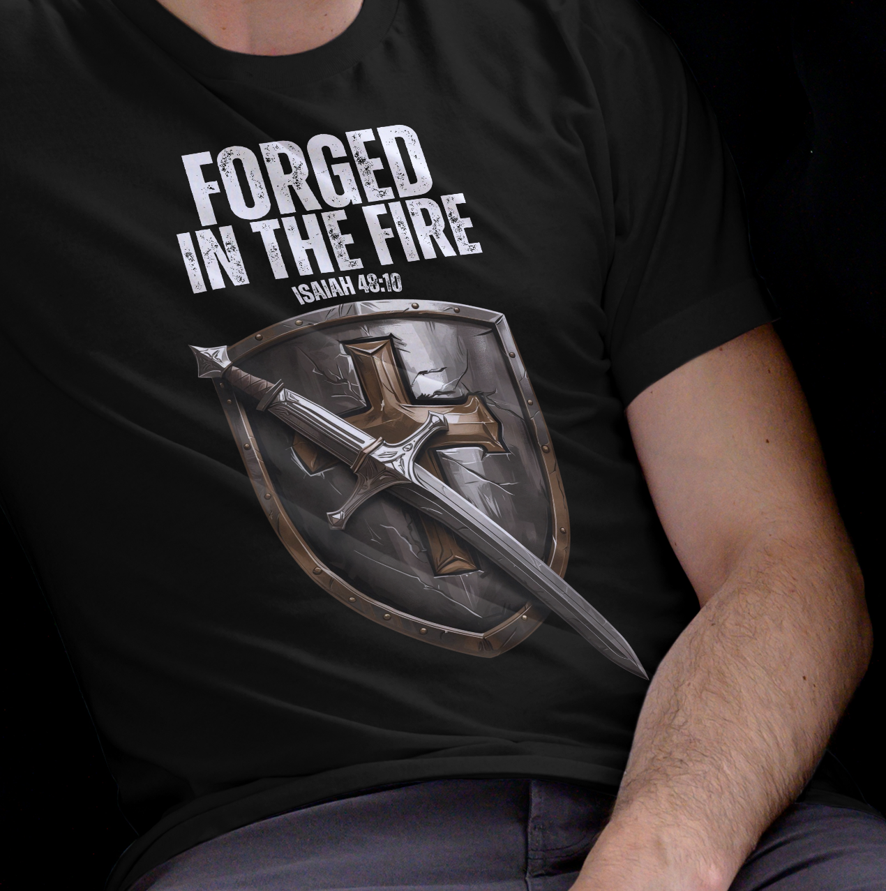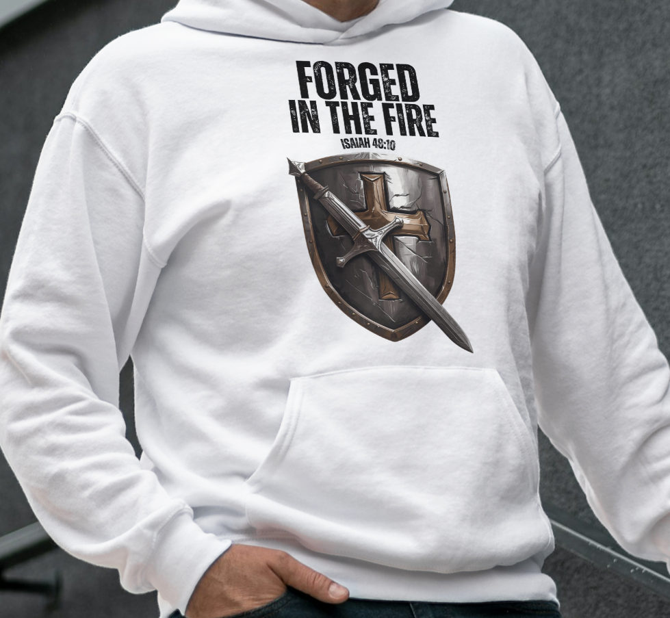 This design features An iron shield with a cross on it and an iron sword. It has Proverbs Isaiah 48:10 which says: Behold, I have refined you, but not as silver; I have tested you in the furnace of affliction.