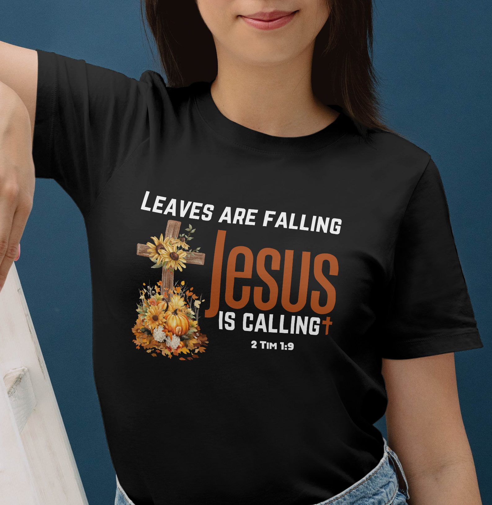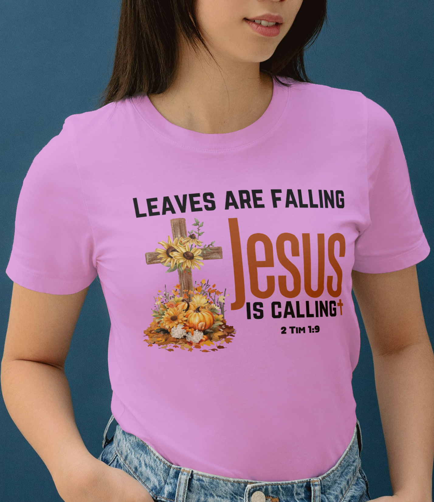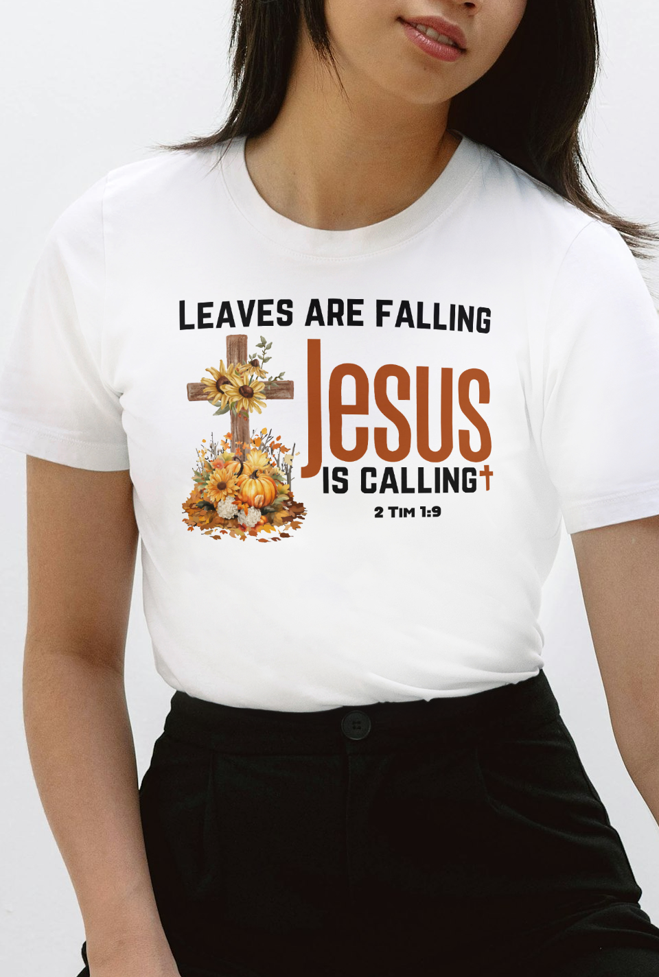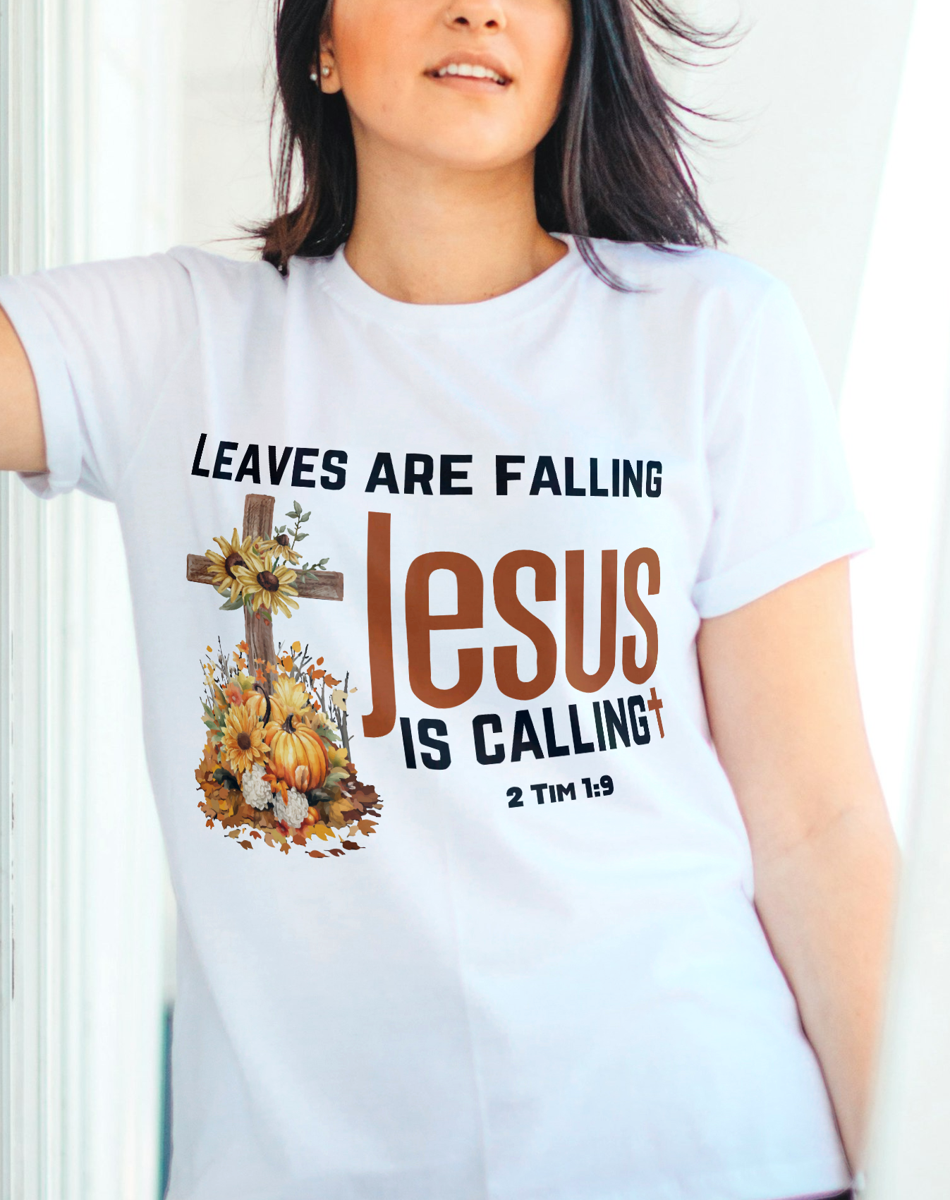 This designs says Leaves are falling Jesus is calling. It features the scripture 2 Tim 1:9 which says: who has saved us and called us with a holy calling, not according to our works, but according to His own purpose and grace which was given to us in Christ Jesus before time began,