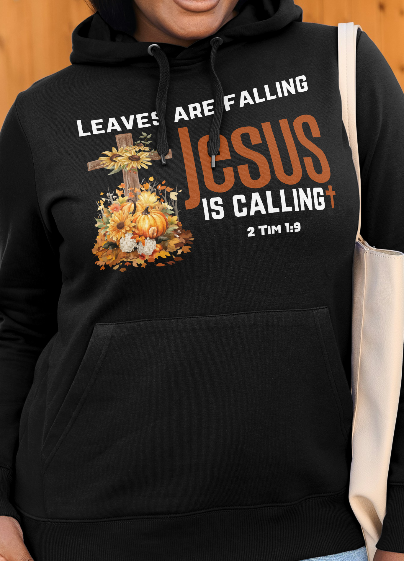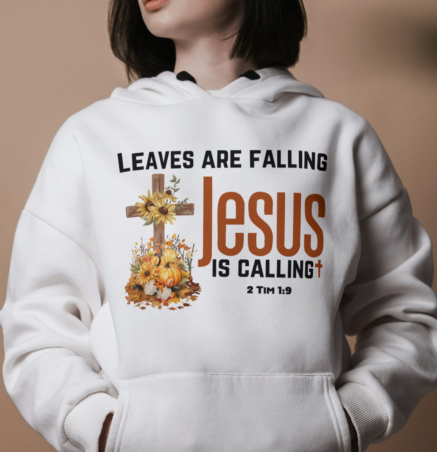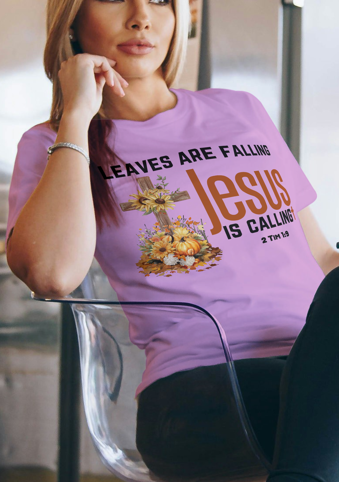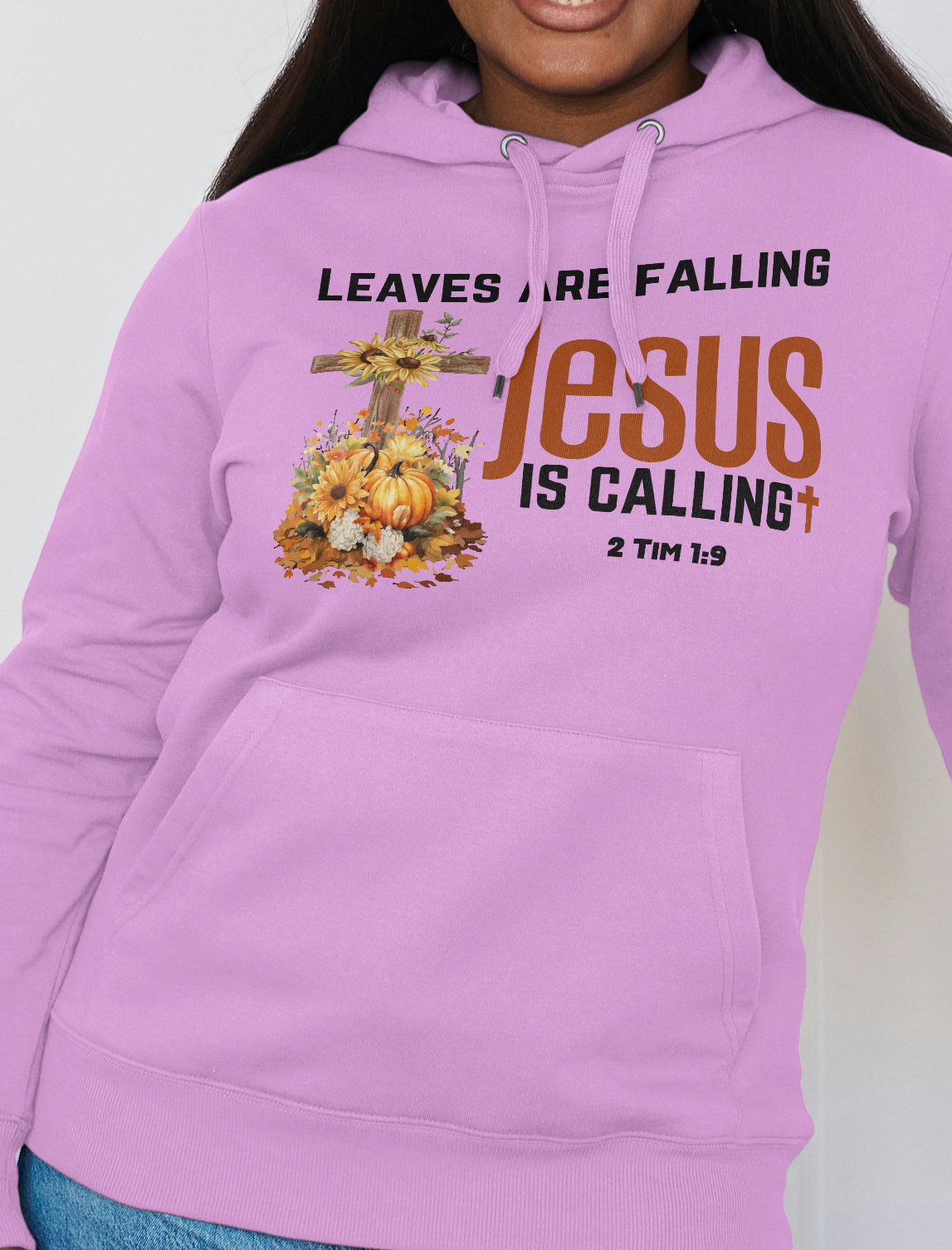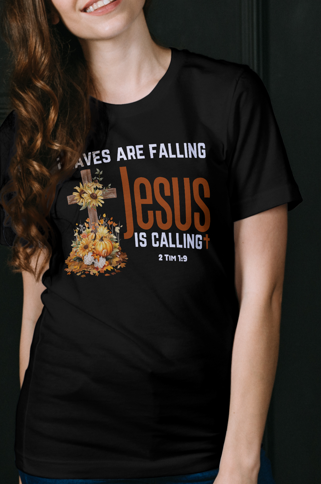 This designs says Leaves are falling Jesus is calling. It features the scripture 2 Tim 1:9 which says: who has saved us and called us with a holy calling, not according to our works, but according to His own purpose and grace which was given to us in Christ Jesus before time began,