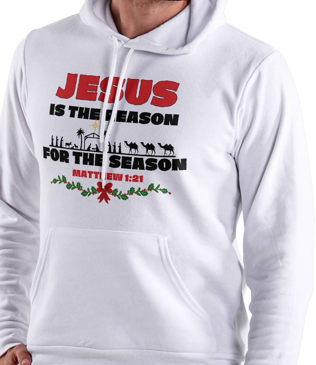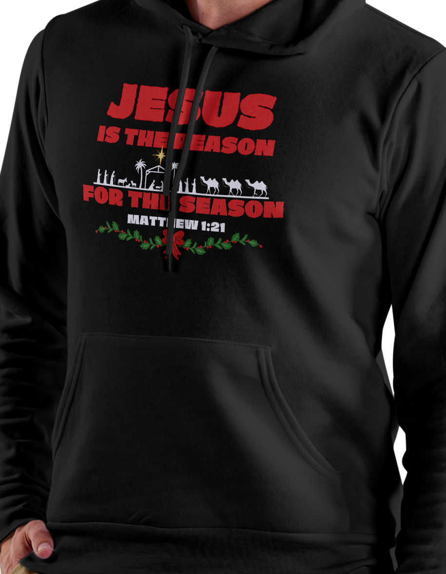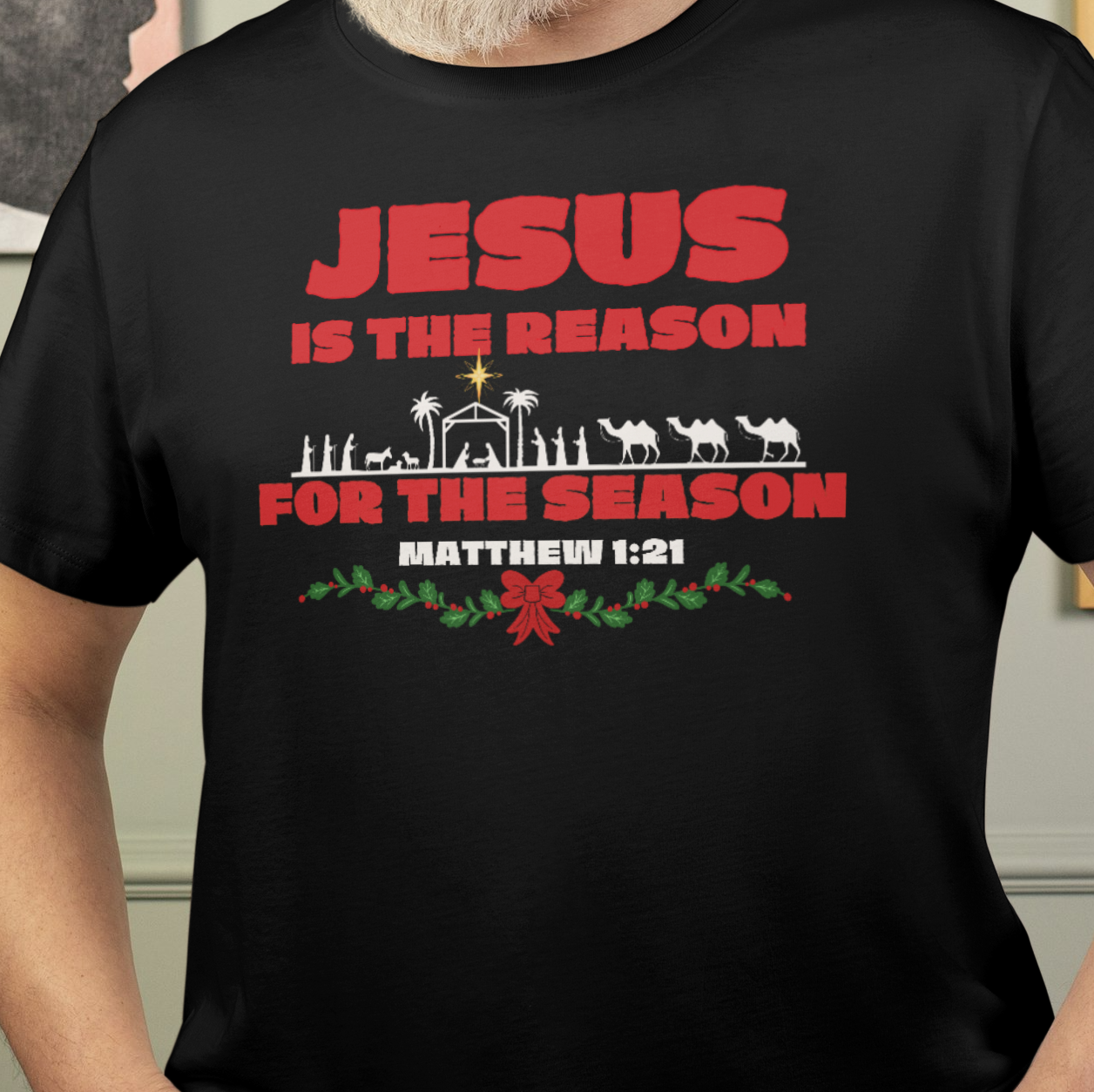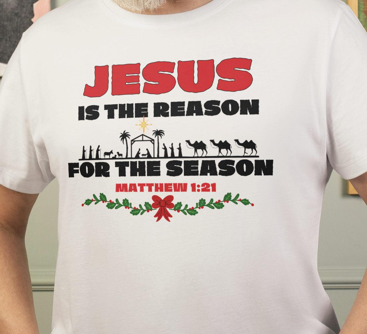 Jesus is the reason for any season especially Christmas season. Features the nativity scene. And Matthew 1:21 which says: And she will bring forth a Son, and you shall call His name Jesus, for He will save His people from their sins.” We should remember the miracle birth all year but celebrate Him in the Christmas season.