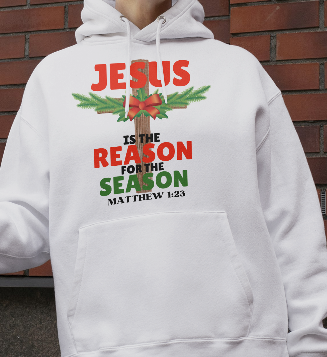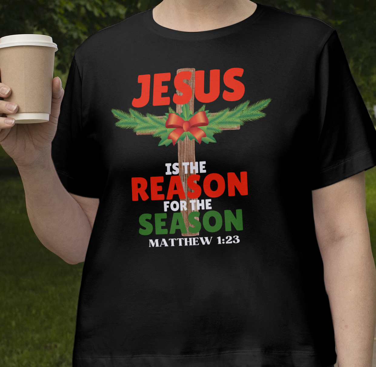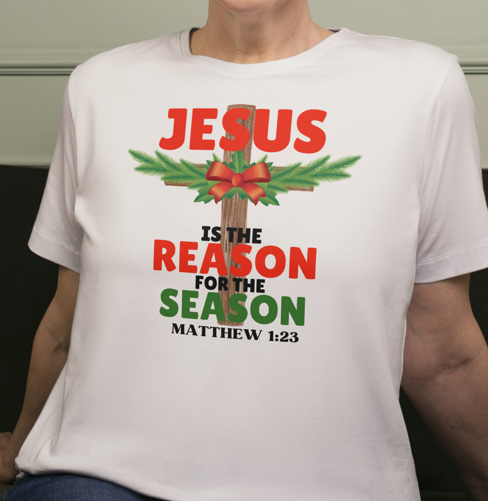 Jesus is the reason for the Christmas season. Features the a cross with pine tree accent and a bow on the cross. Also features the scripture Matthew 1:23 which says: “Behold, the virgin shall be with child, and bear a Son, and they shall call His name Immanuel,” which is translated, “God with us.” The miracle birth and salvation is the reason we celebrate and Praise His name!