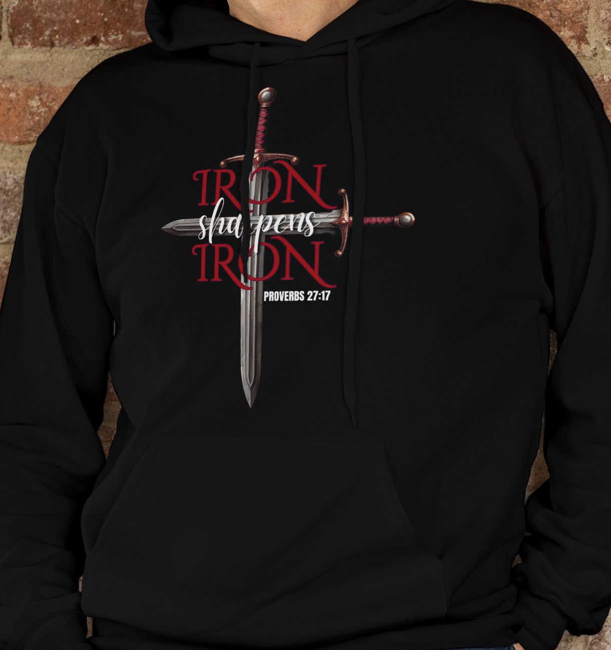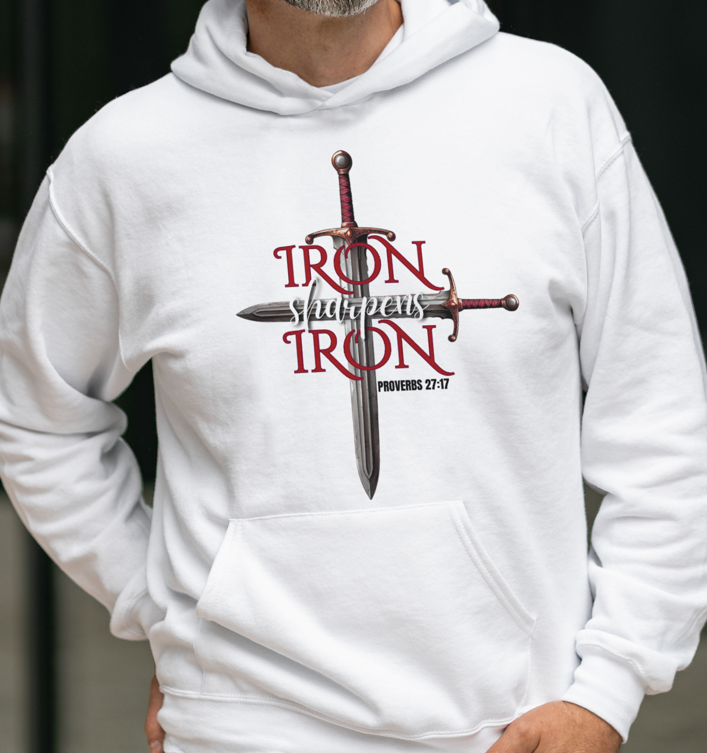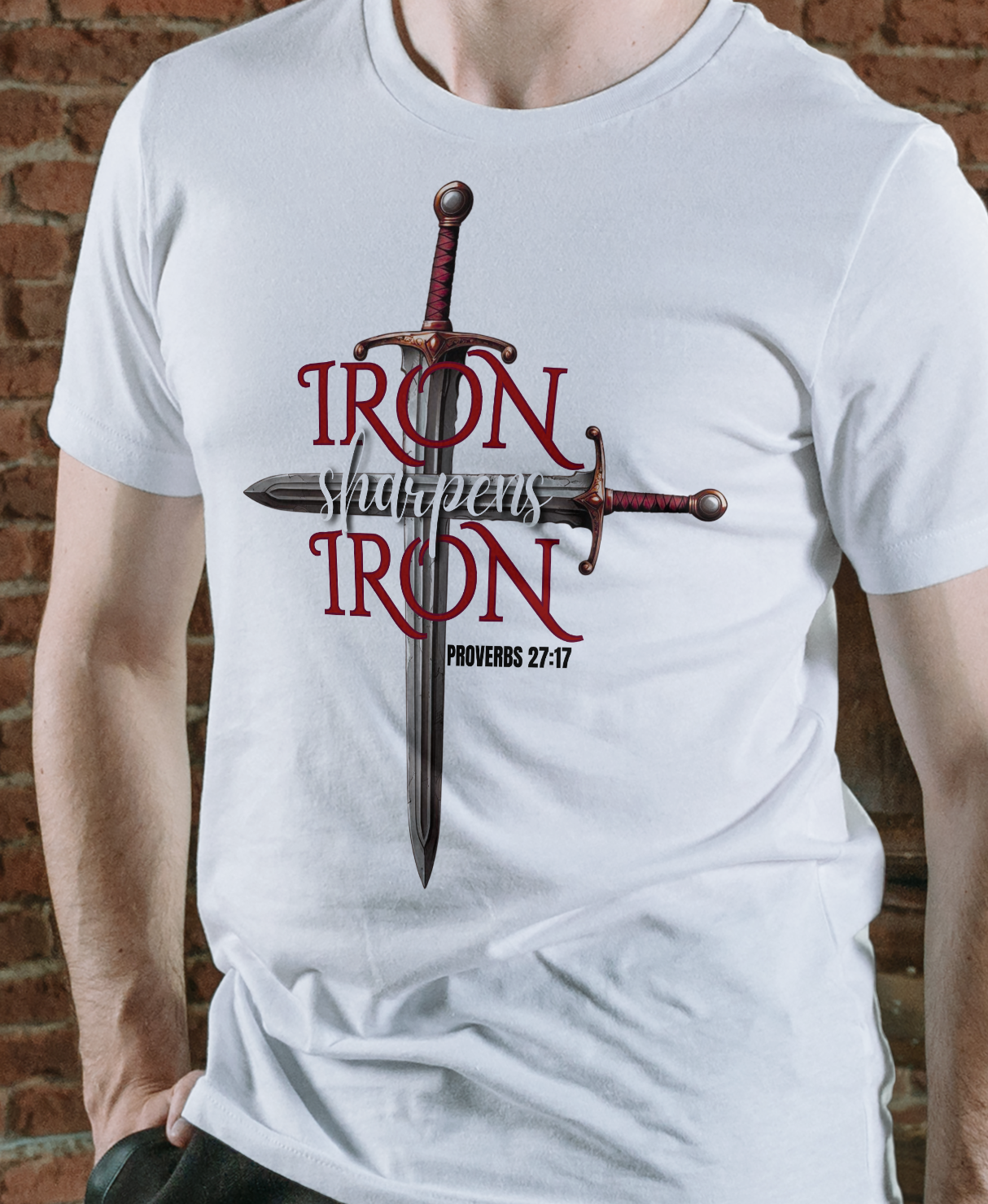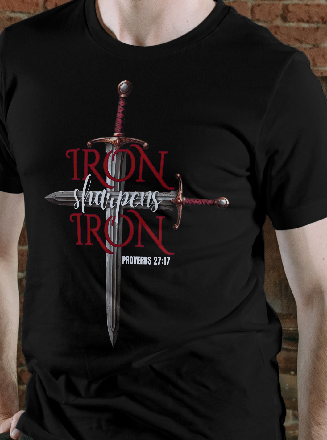 This design features two swords crossing into the shape of a cross. It has Proverbs 27:17 which says: As iron sharpens iron, so a man sharpens the countenance of his friends.