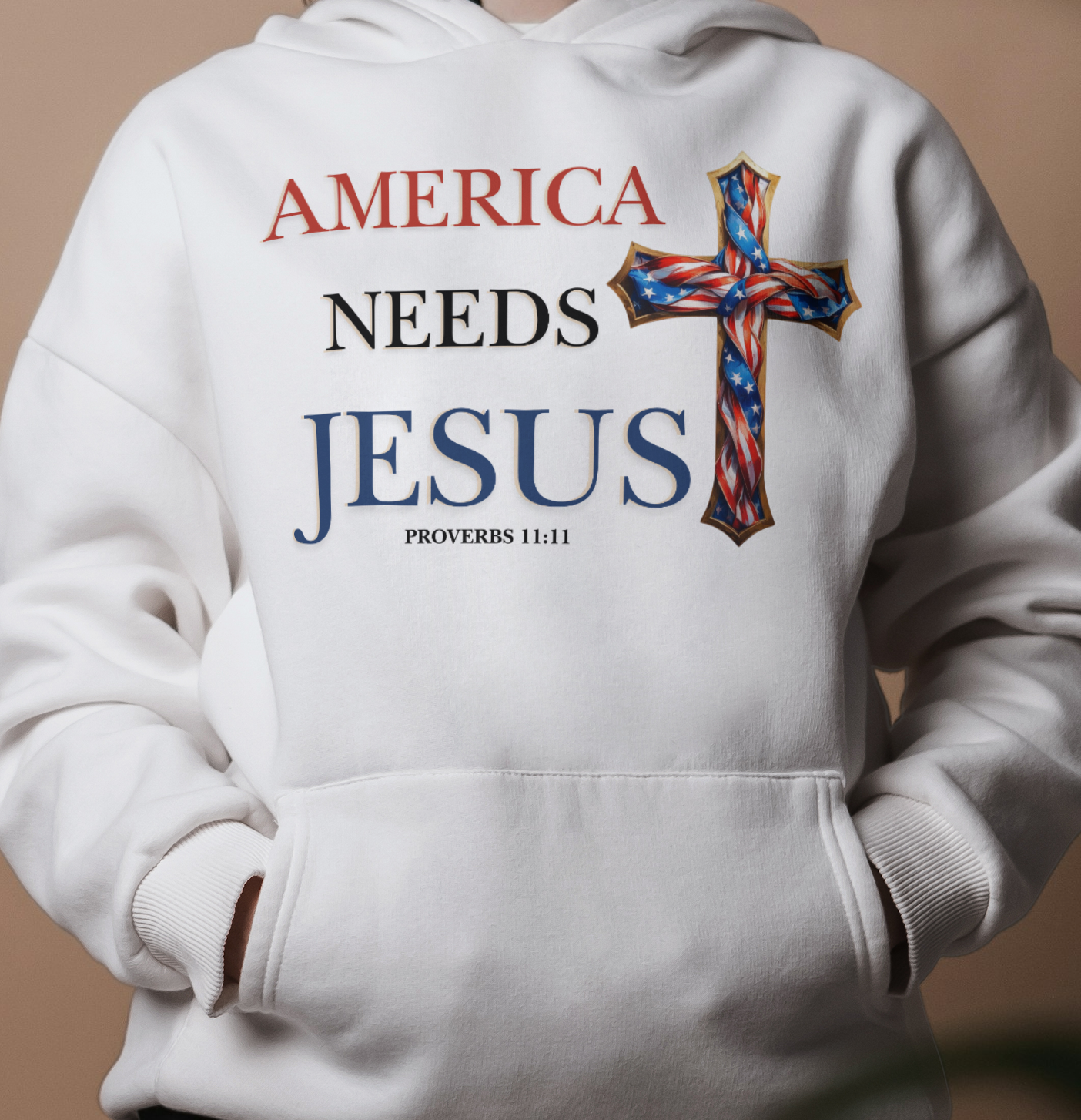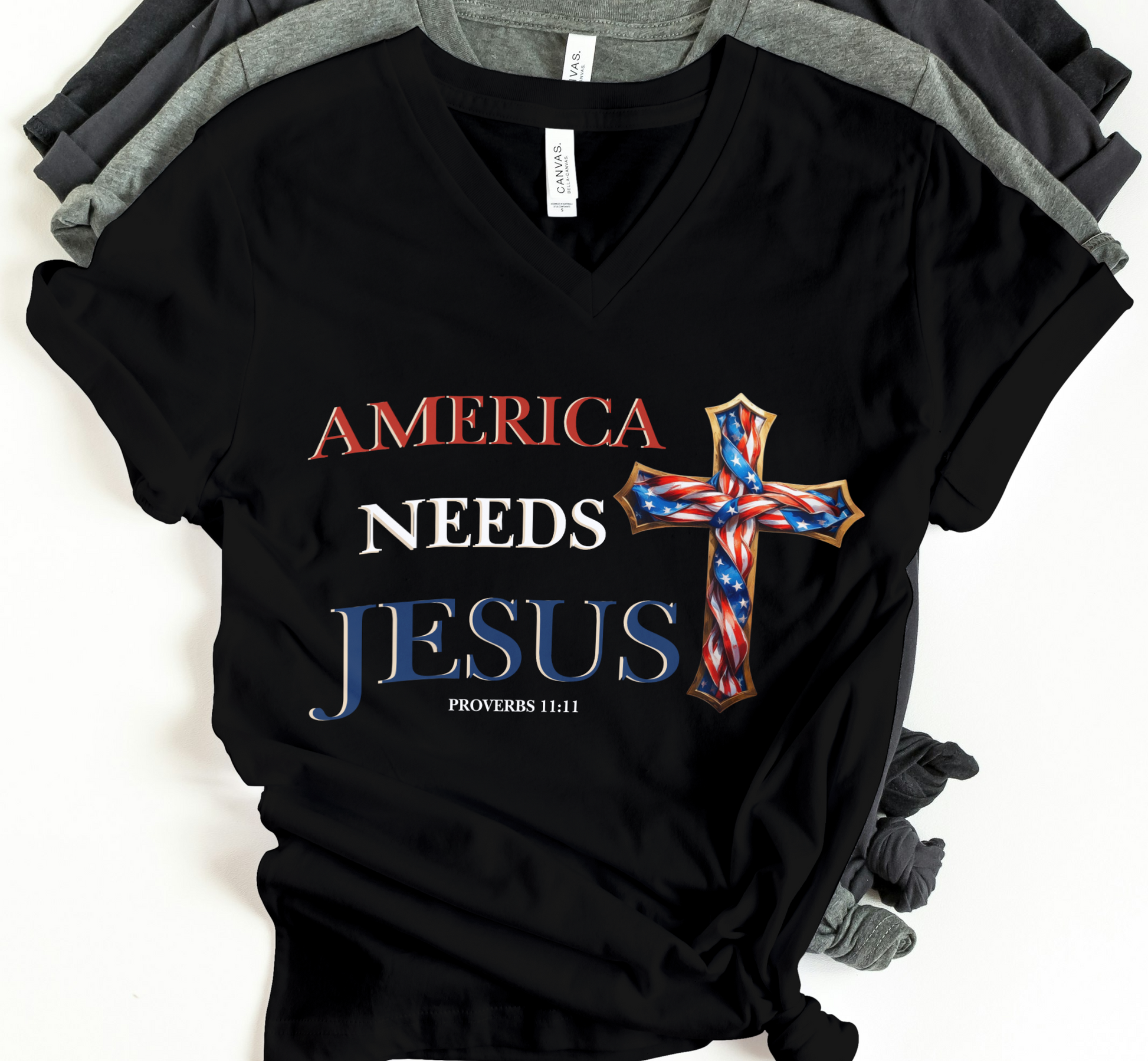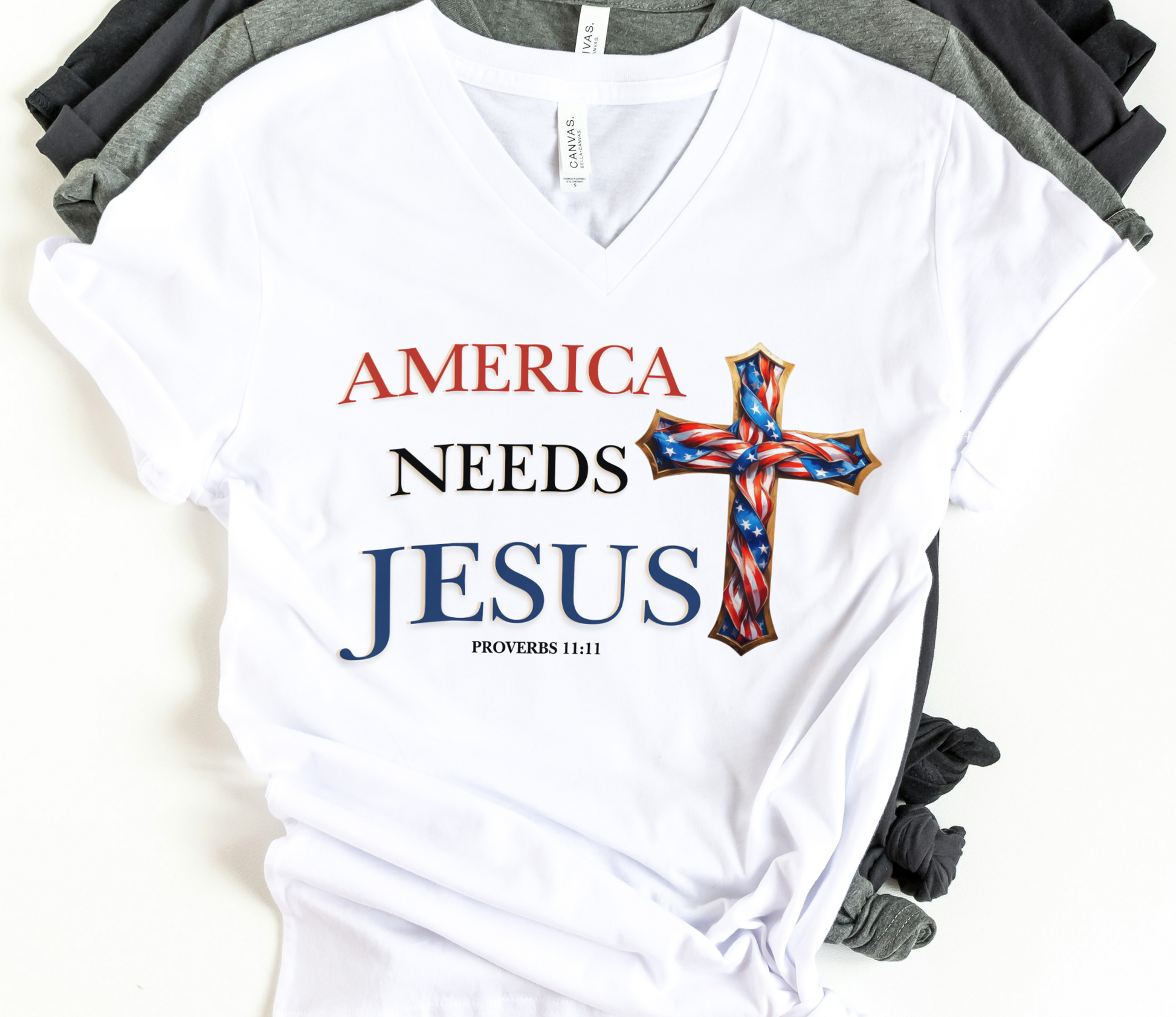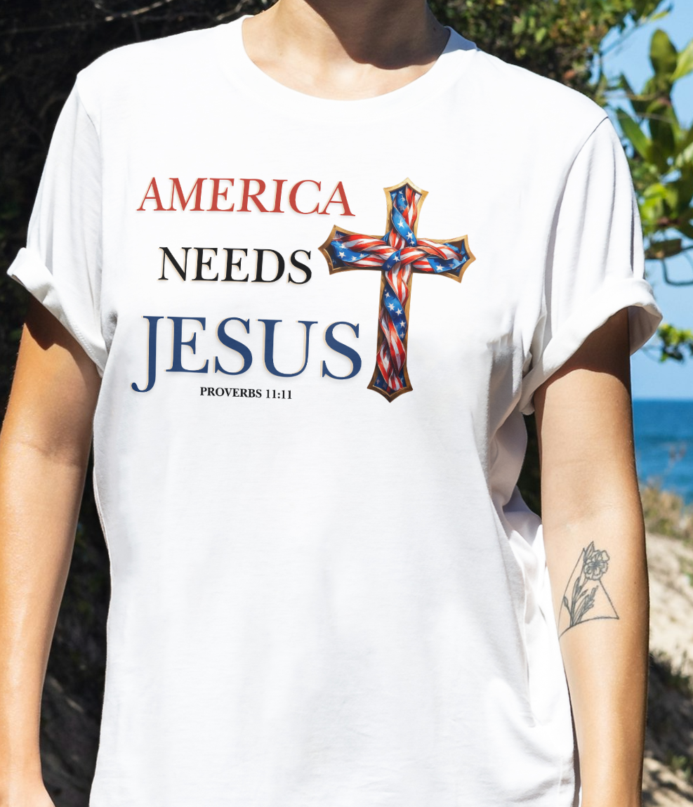 This design has a cool cross with the American flag in it and says simply America needs Jesus. It also features the scripture Proverbs 11:11 which says: By the blessing of the upright the city is exalted, But it is overthrown by the mouth of the wicked. Let us get back to fearing God!