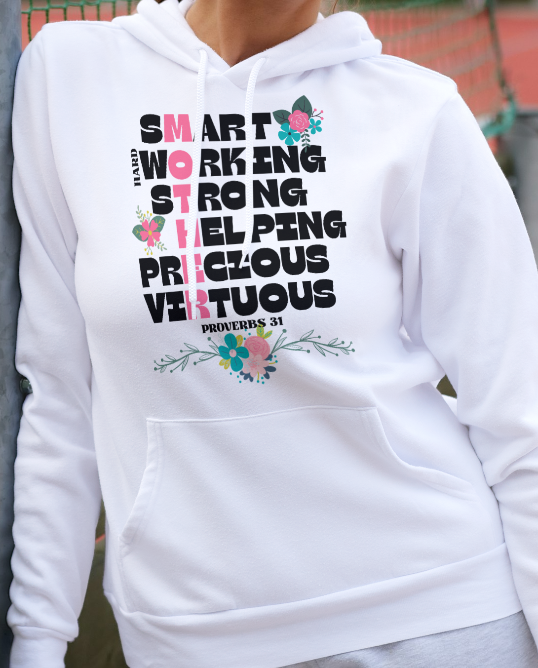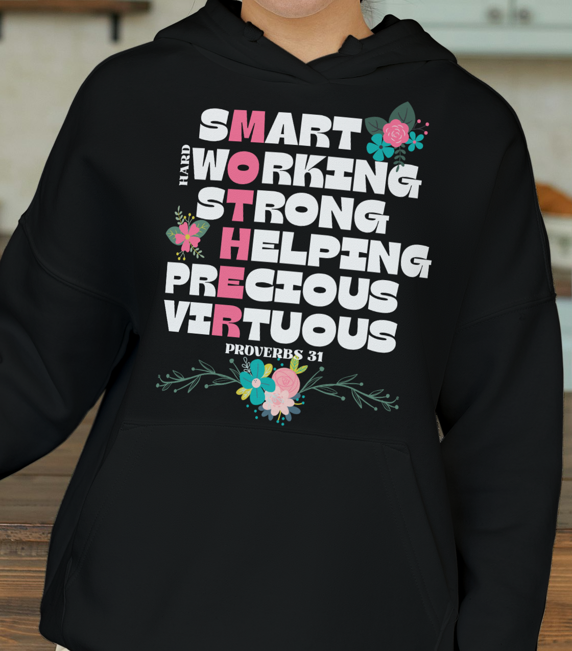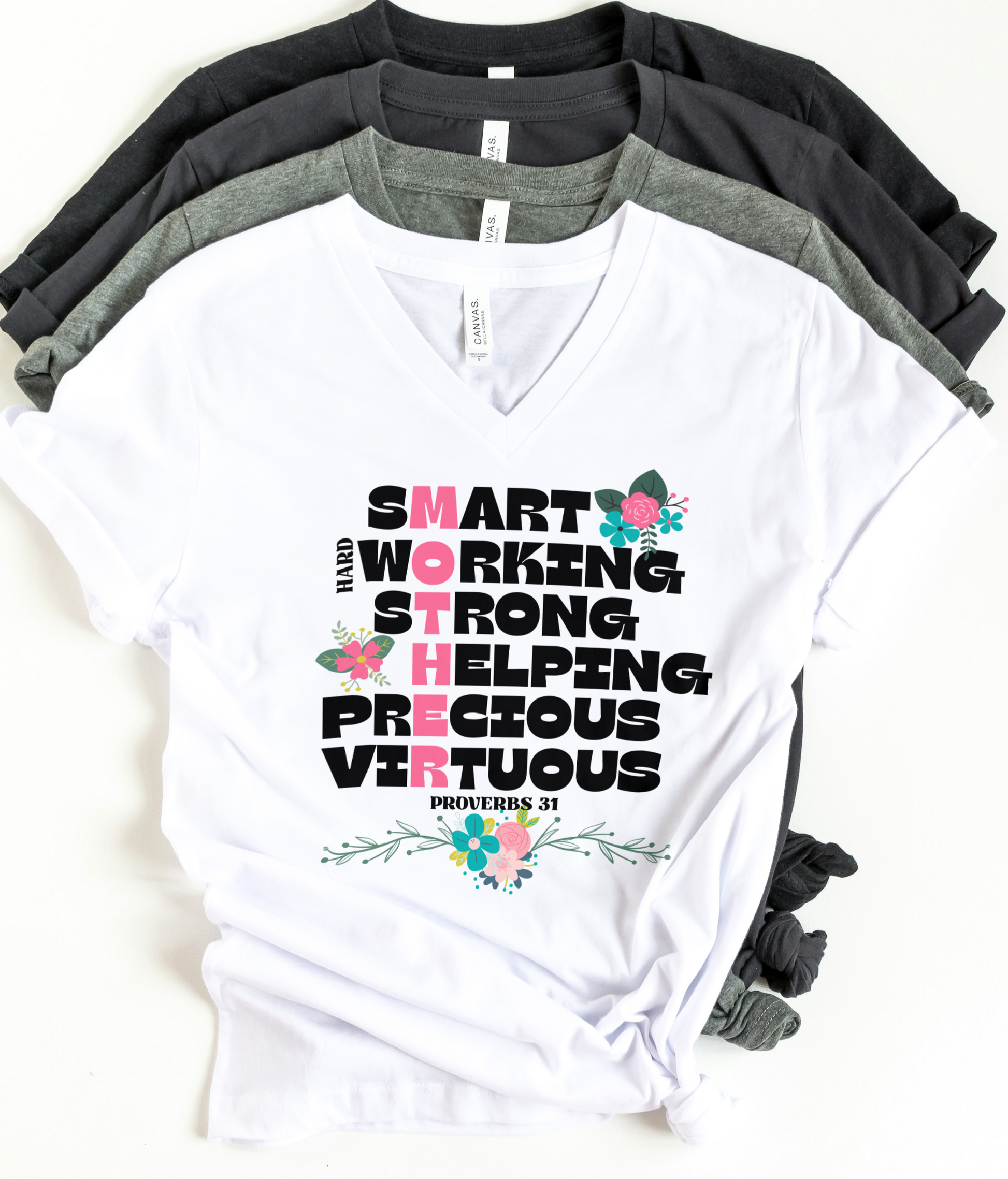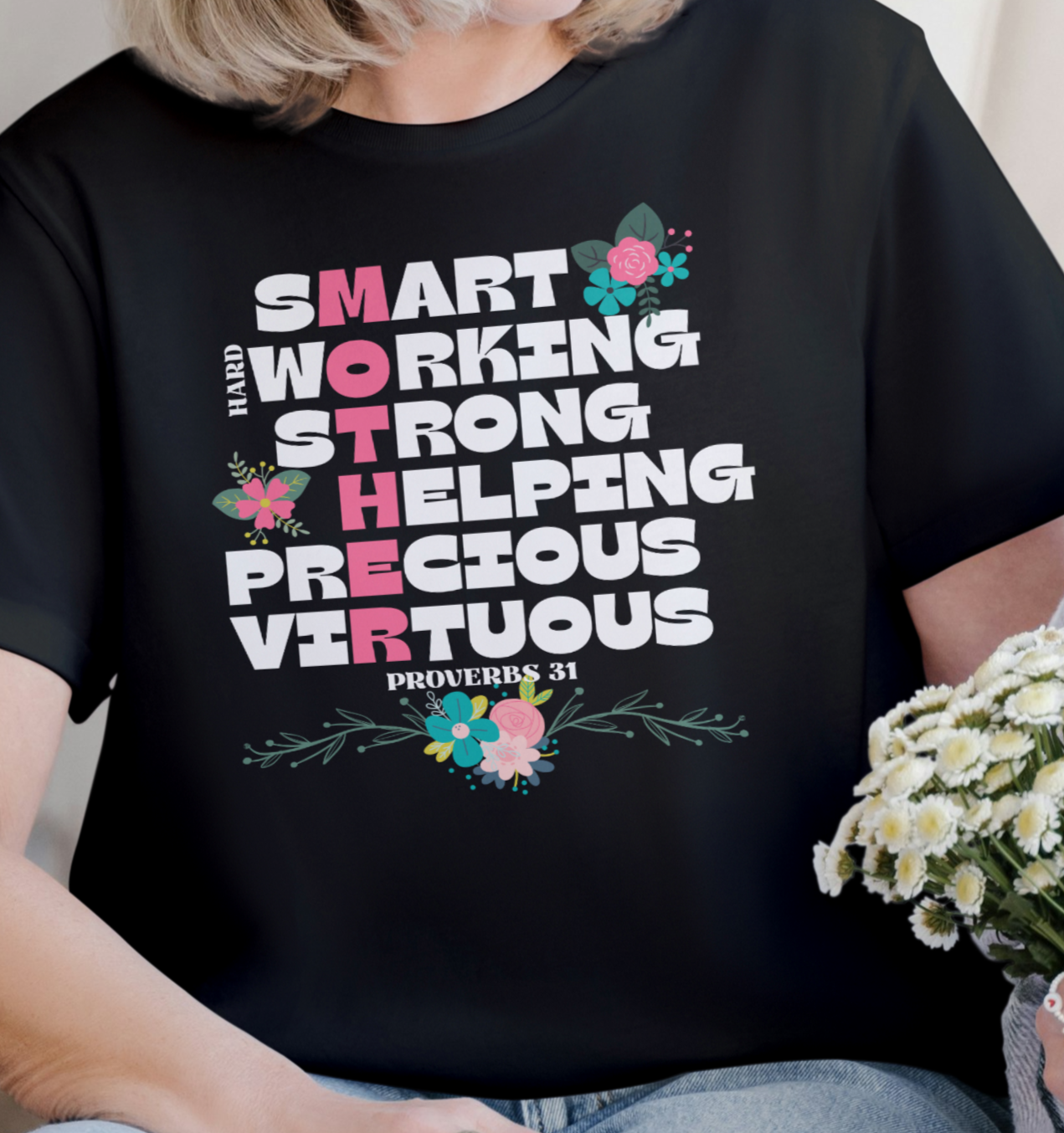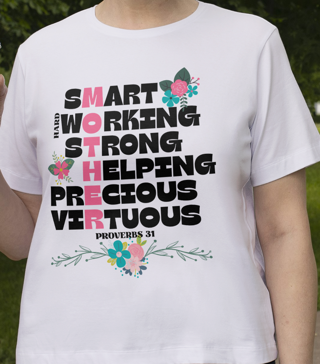 Attibutes of mothers that came from Proverbs 31! This design features a list of qulaities found in scripture about mothers and highlighted downward within those words is "mother".