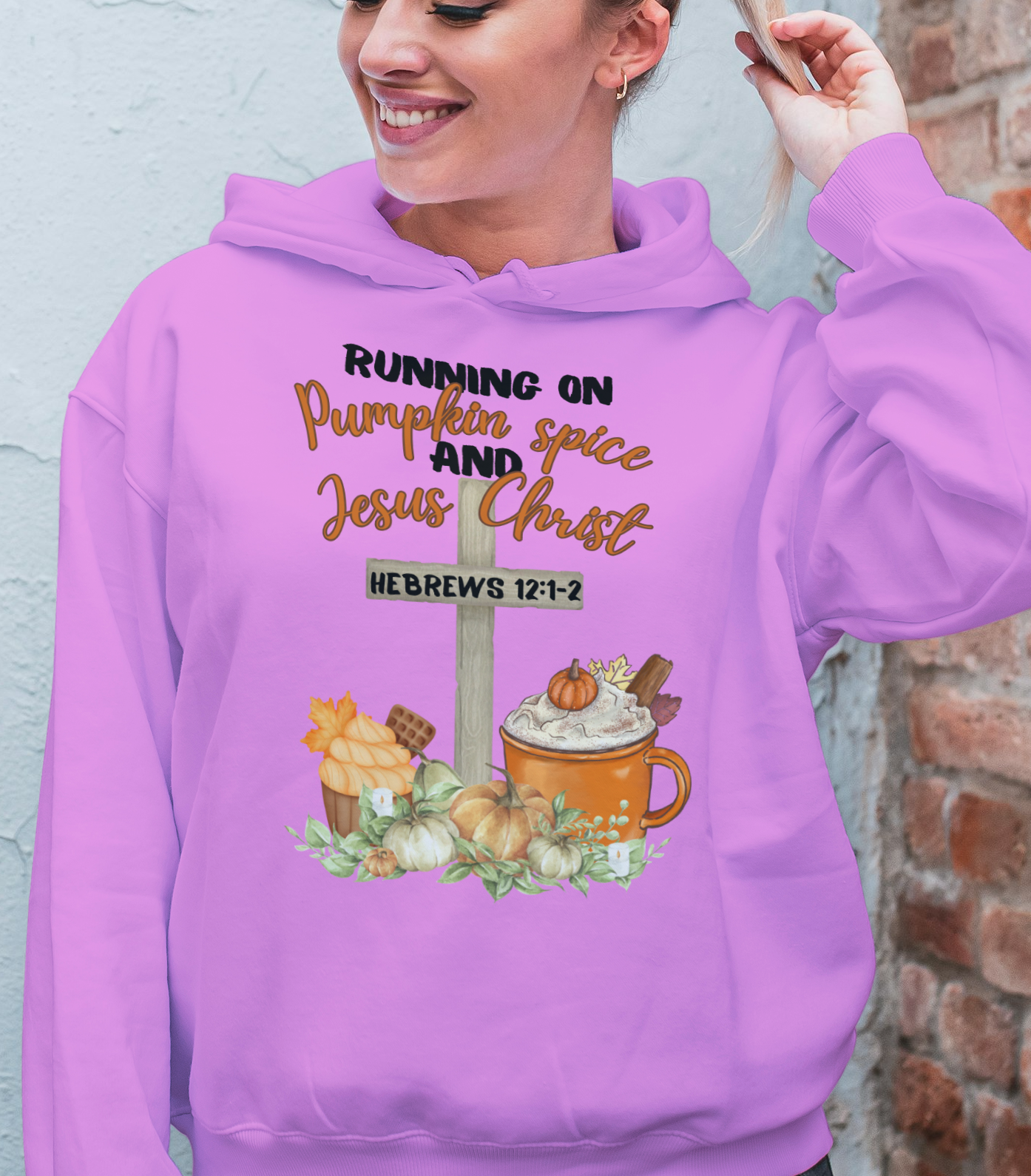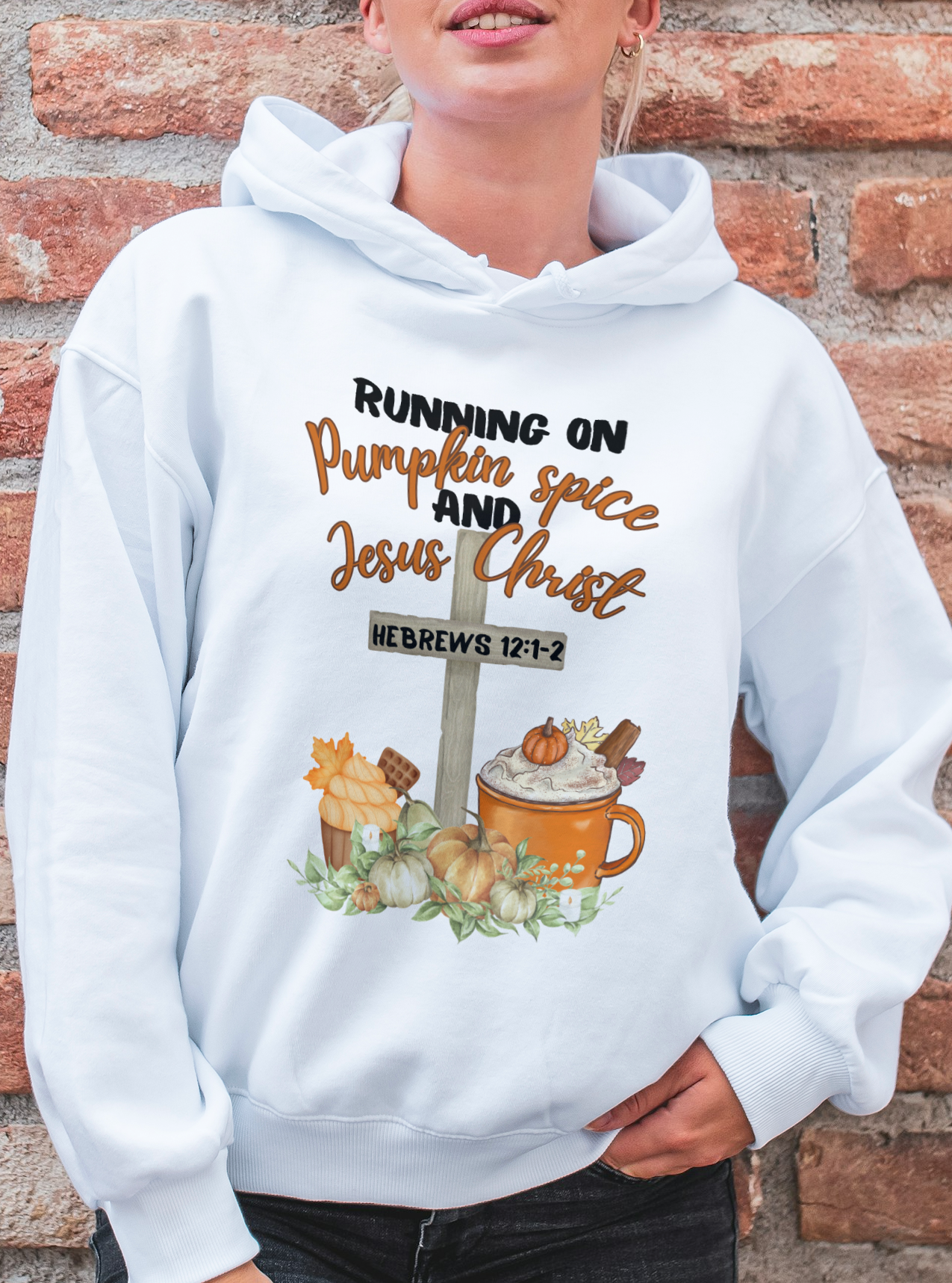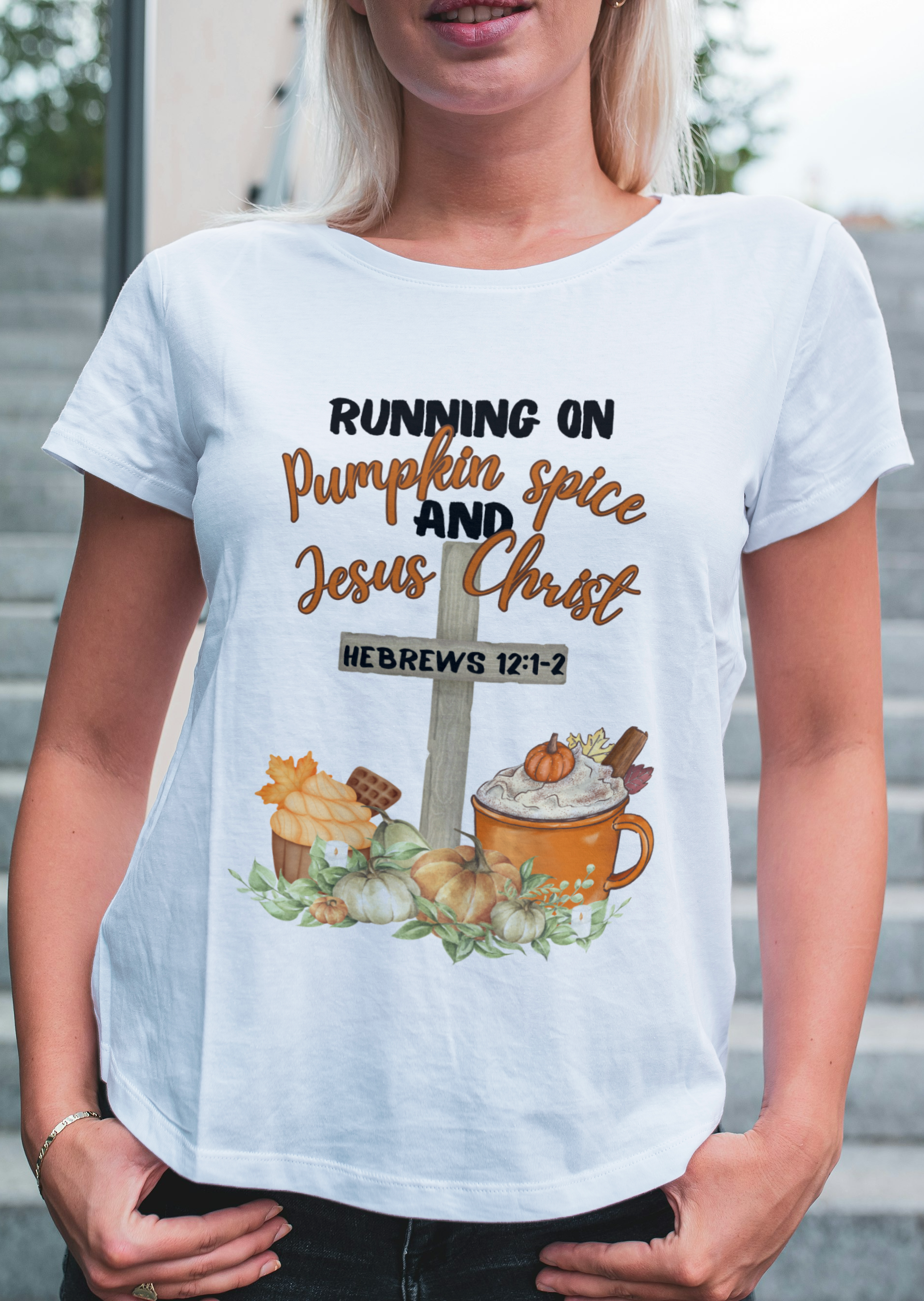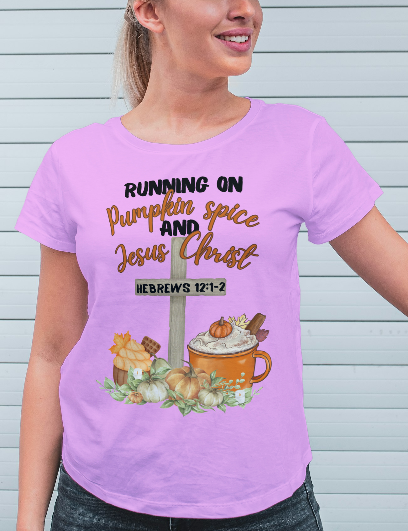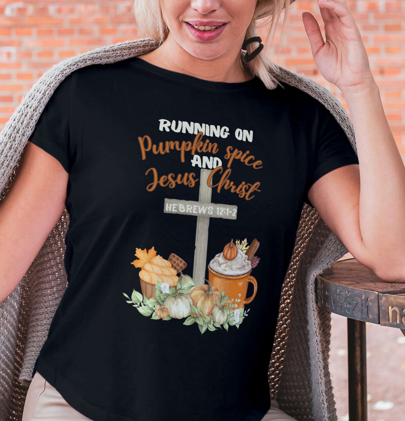 Just added to our fall collection...Says running on Pumpkin spice and Jesus Christ. Features the scripture Hebrews 12:1-2 which says: Therefore we also, since we are surrounded by so great a cloud of witnesses, let us lay aside every weight, and the sin which so easily ensnares us, and let us run with endurance the race that is set before us, 2 looking unto Jesus, the author and finisher of our faith, who for the joy that was set before Him endured the cross, despising the shame, and has sat down at the right hand of the throne of God. The image on this shirt has a wooden cross and pumpkin spice muffin and latte.