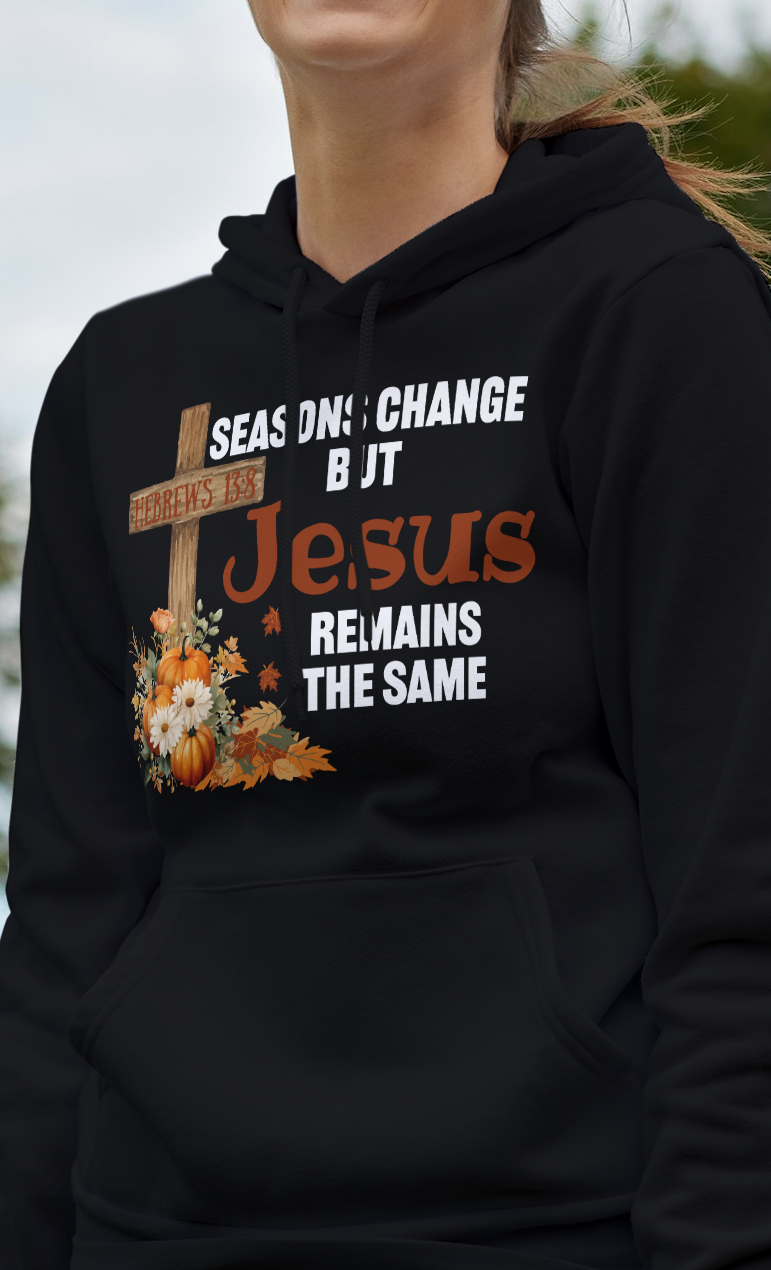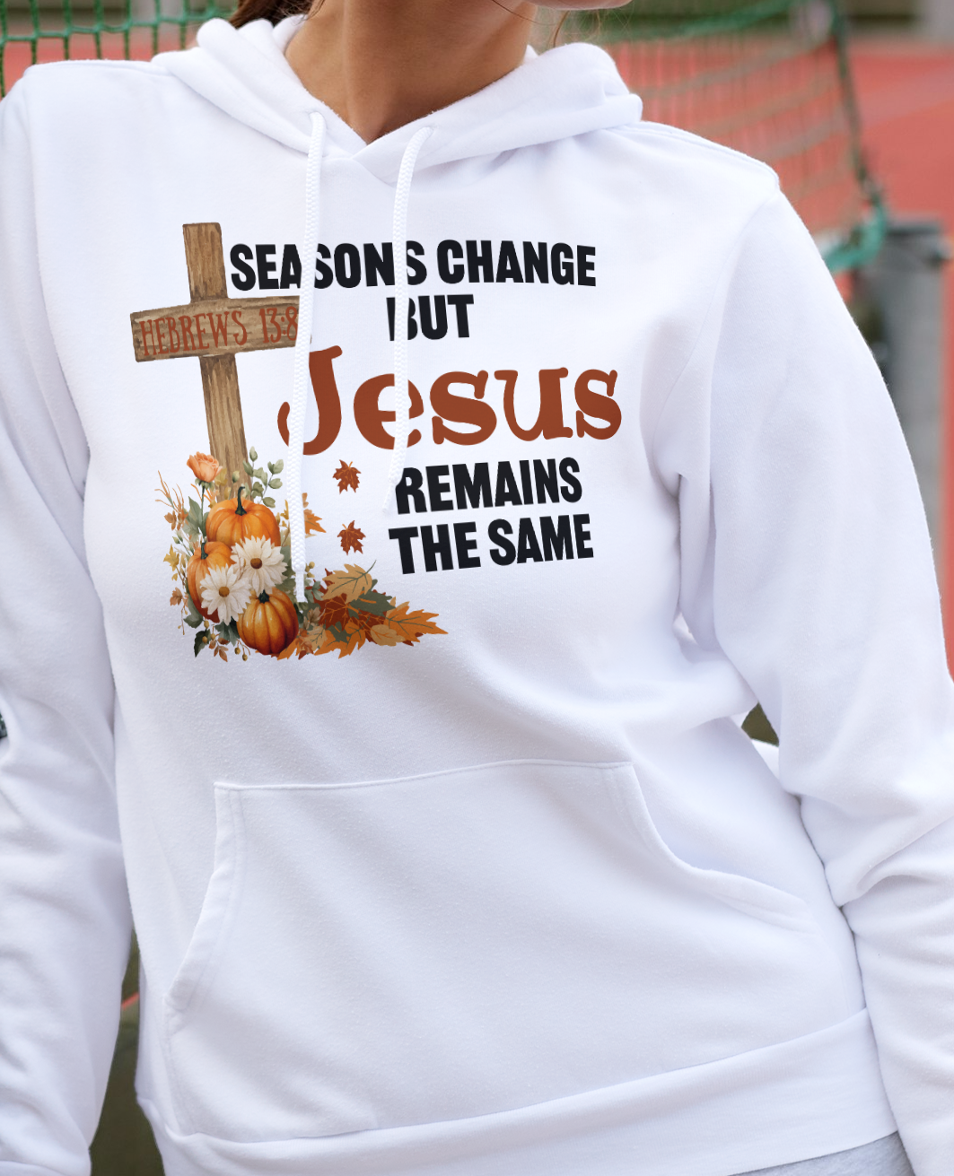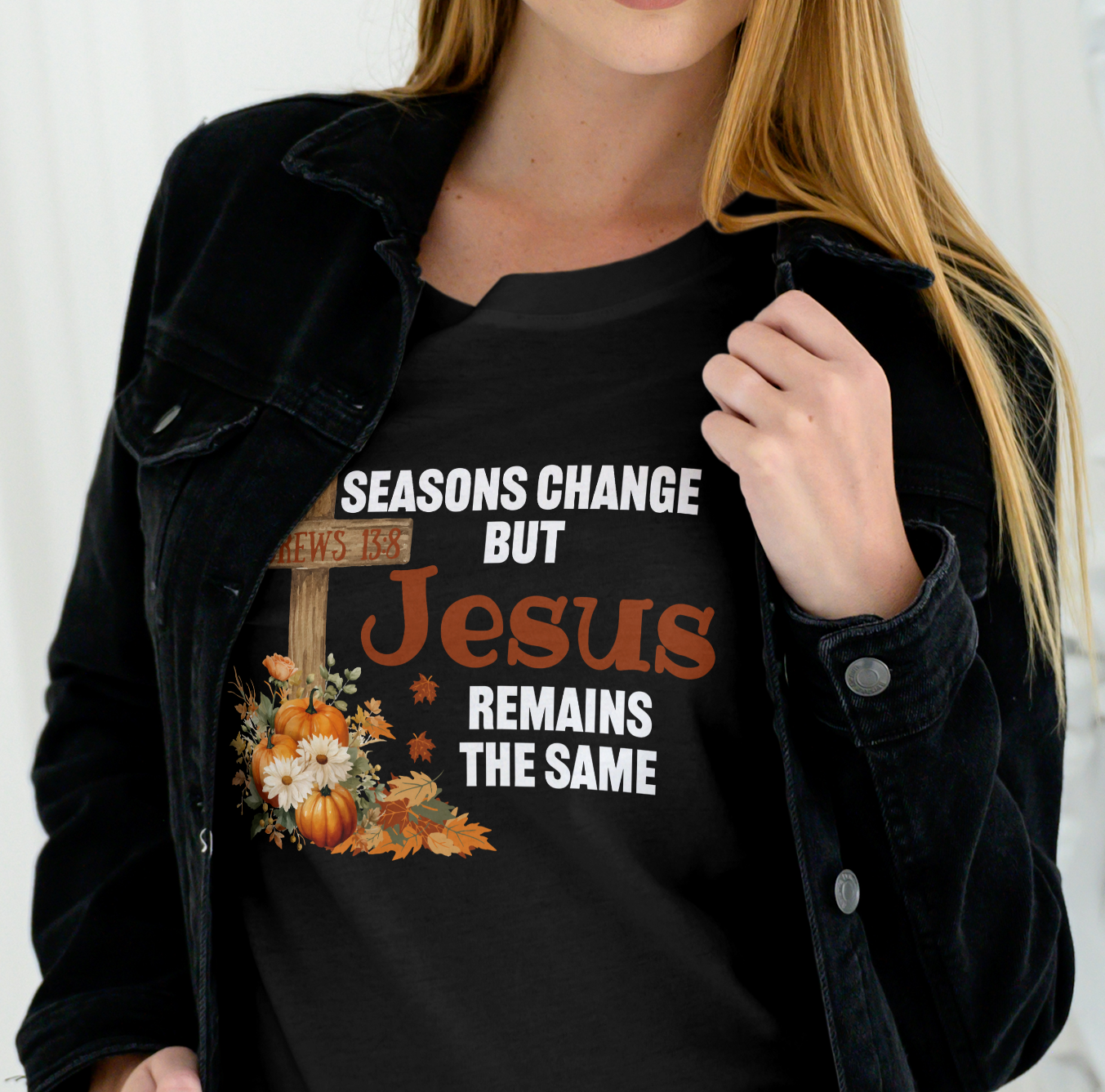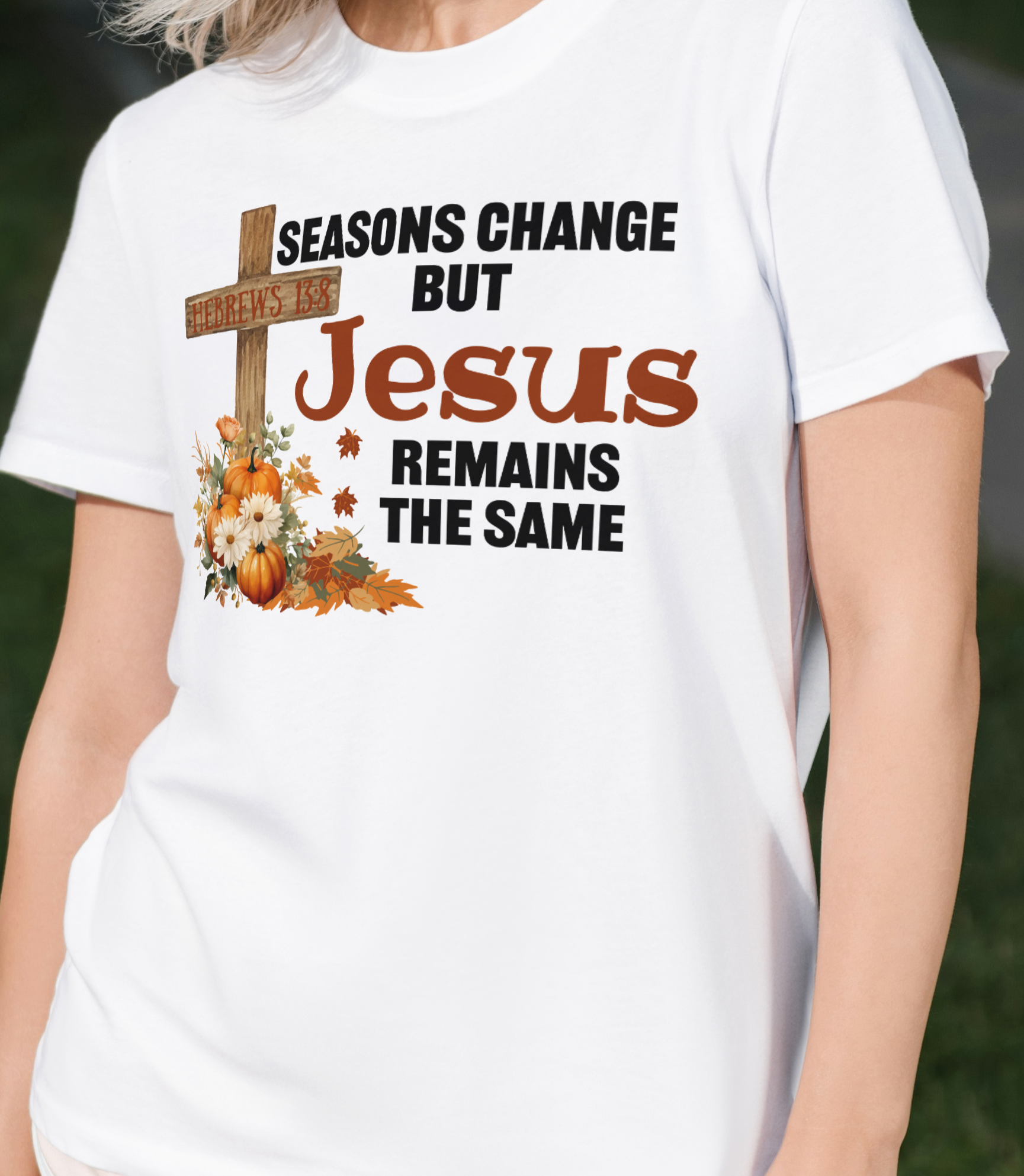 Just added to our fall collection...Seasons change but Jesus remains the same. Features the scripture Hebrews 13:8 which says: Jesus Christ is the same yesterday, today, and forever.