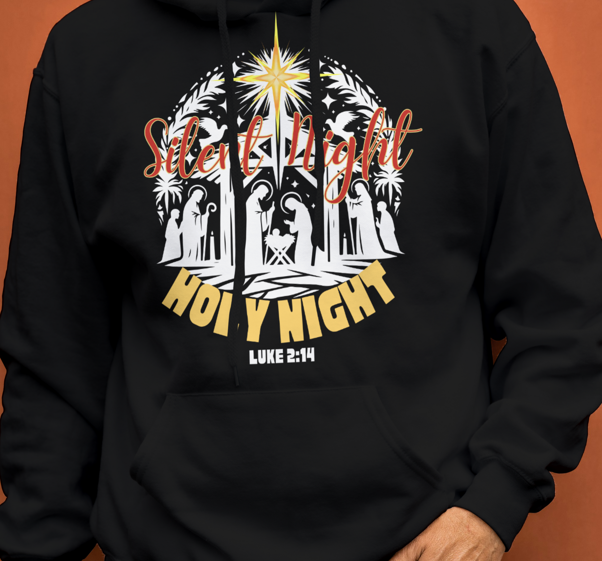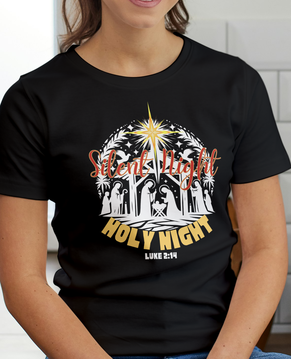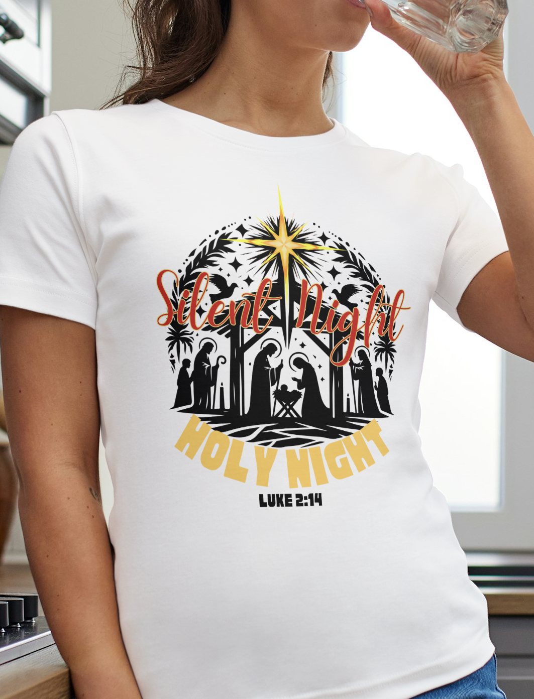 Silent night Holy night features the nativity and the scripture Luke 2:14 which says: “Glory to God in the highest, And on earth peace, goodwill toward men!” An angel told the shephards not to be afraid and that he brings good tidings of great joy to all people on this day! It was a holy night indeed!