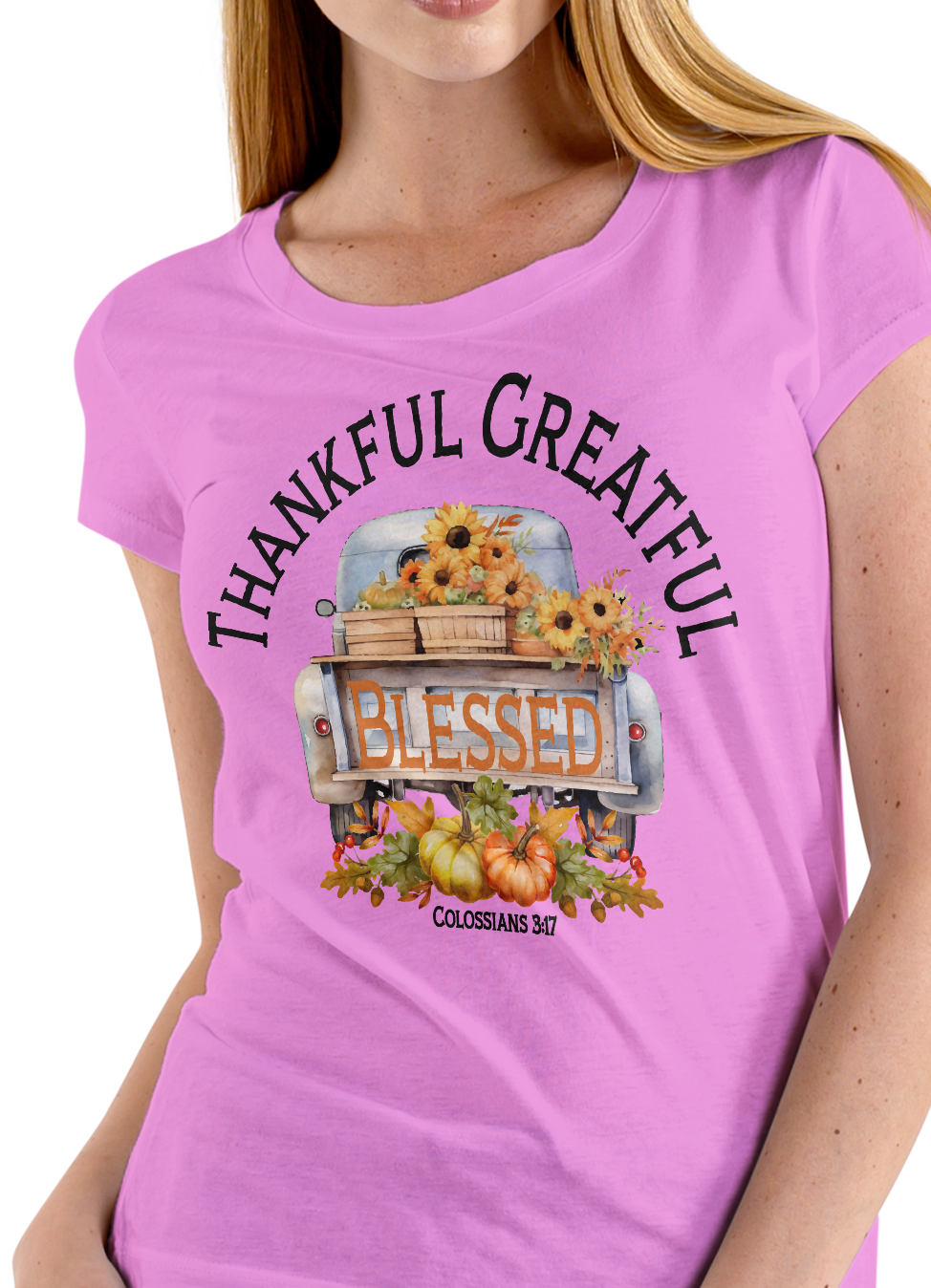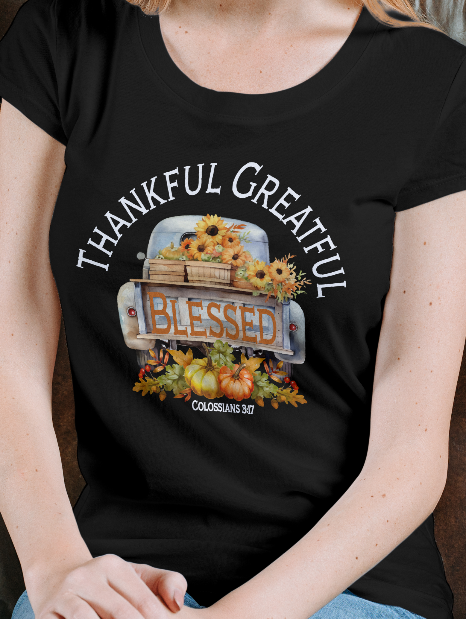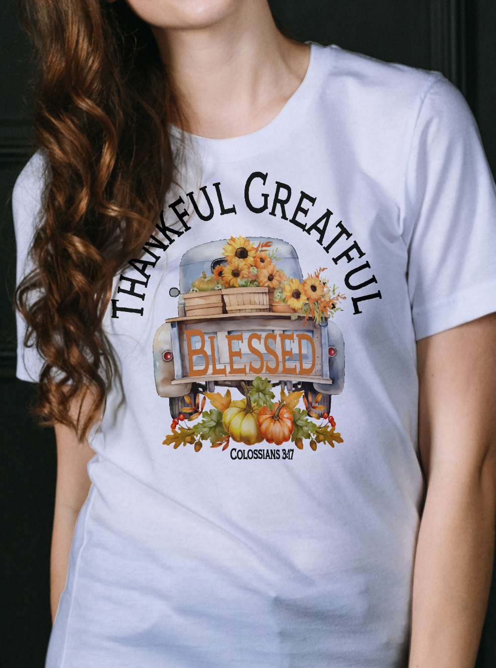 Just added to our fall collection...Says Thankful Greatful Blessed. Features the scripture Colossians 3:17 which says: And whatever you do in word or deed, do all in the name of the Lord Jesus, giving thanks to God the Father through Him.