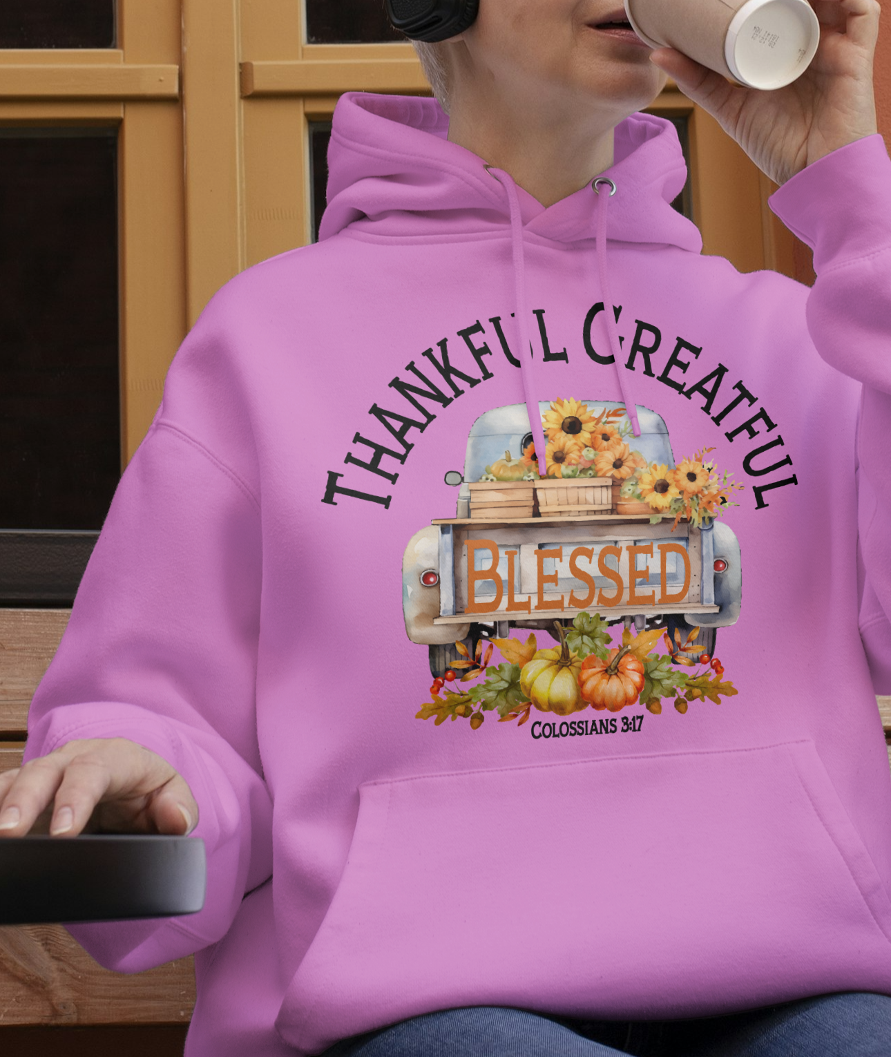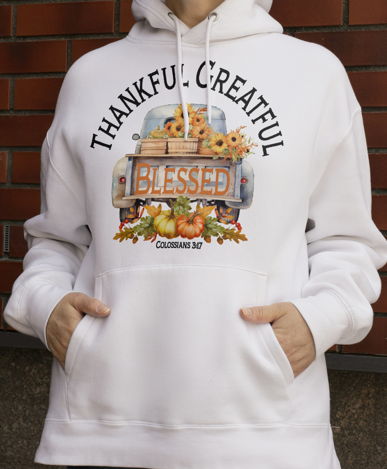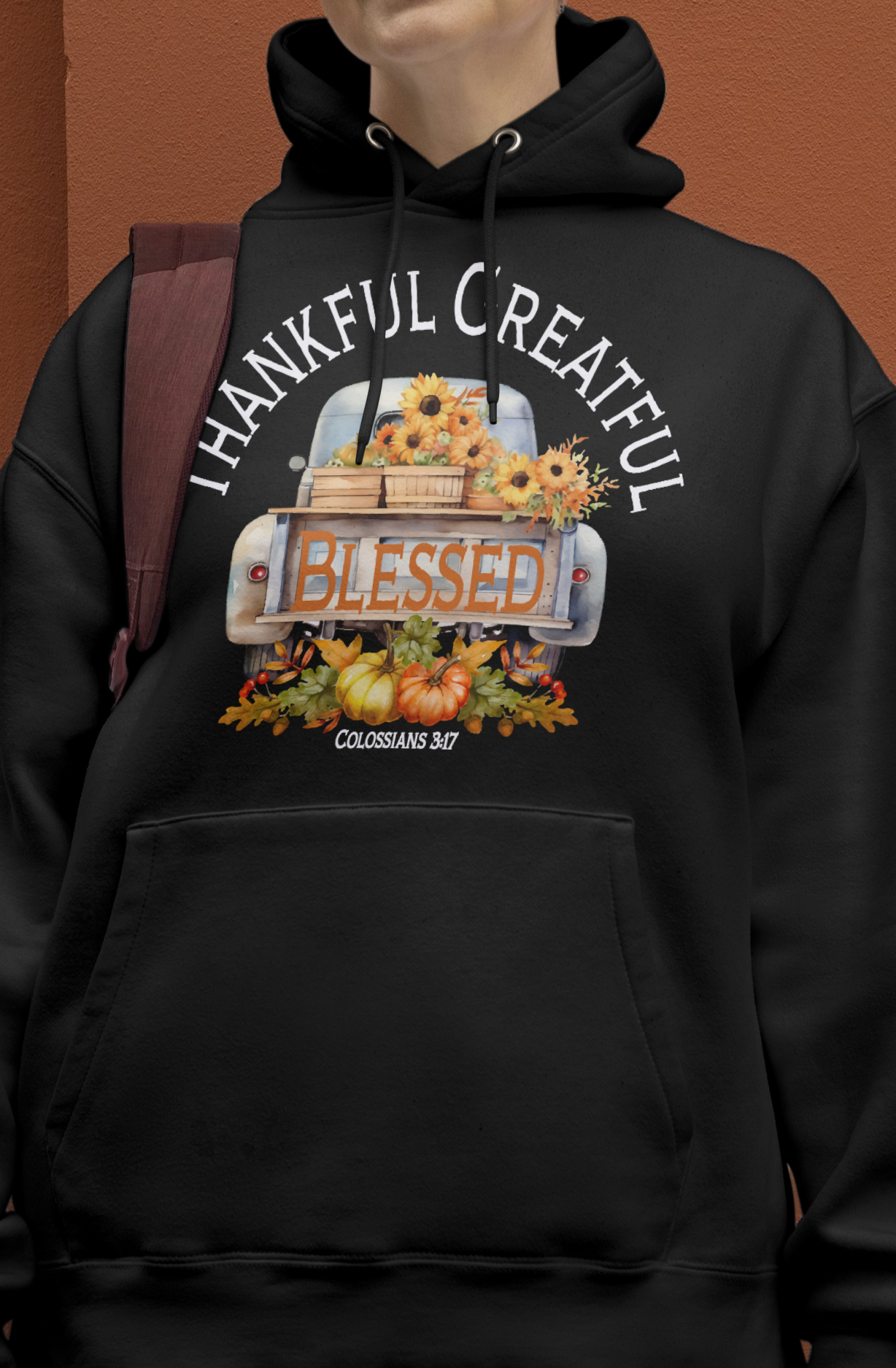 Just added to our fall collection...Says Thankful Greatful Blessed. Features the scripture Colossians 3:17 which says: And whatever you do in word or deed, do all in the name of the Lord Jesus, giving thanks to God the Father through Him.