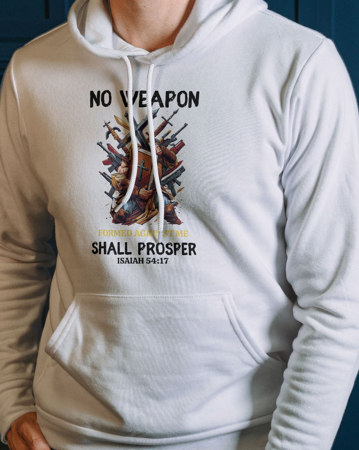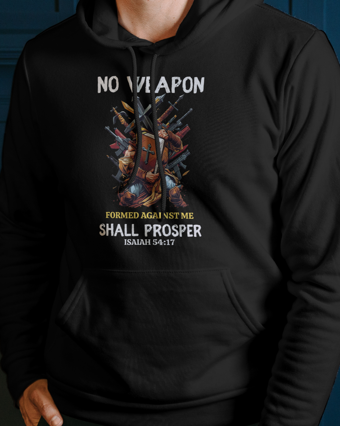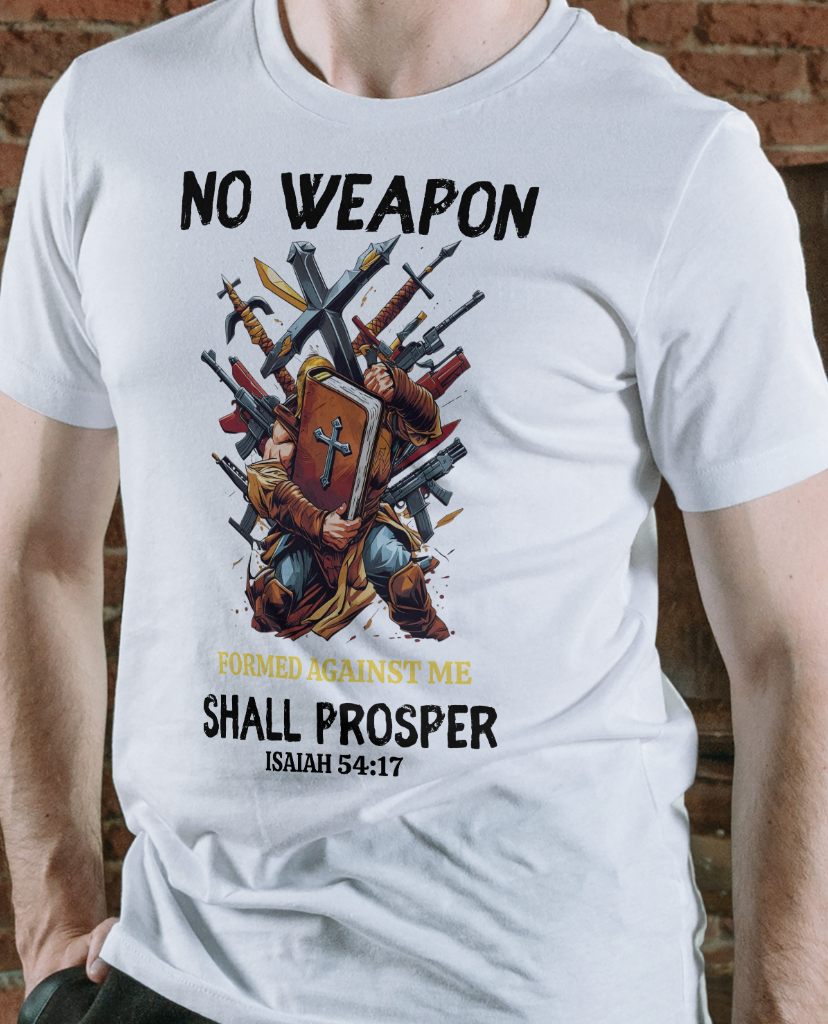 This design features a man holding a giant Bible with weapons trying to come against him. It has Isaiah 54:17 which says: No weapon formed against you shall prosper, And every tongue which rises against you in judgment You shall condemn. This is the heritage of the servants of the Lord, And their righteousness is from Me,” Says the Lord.