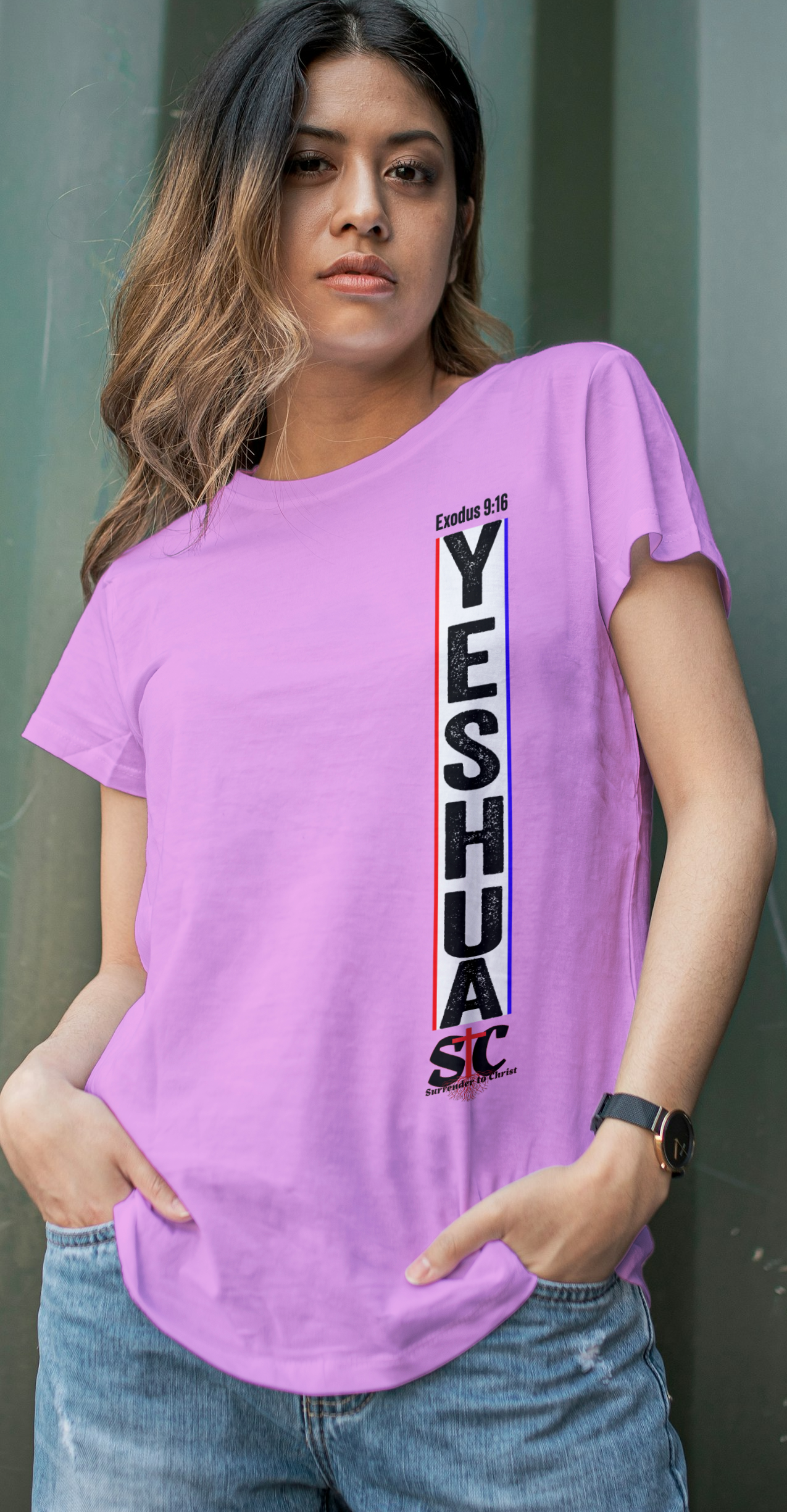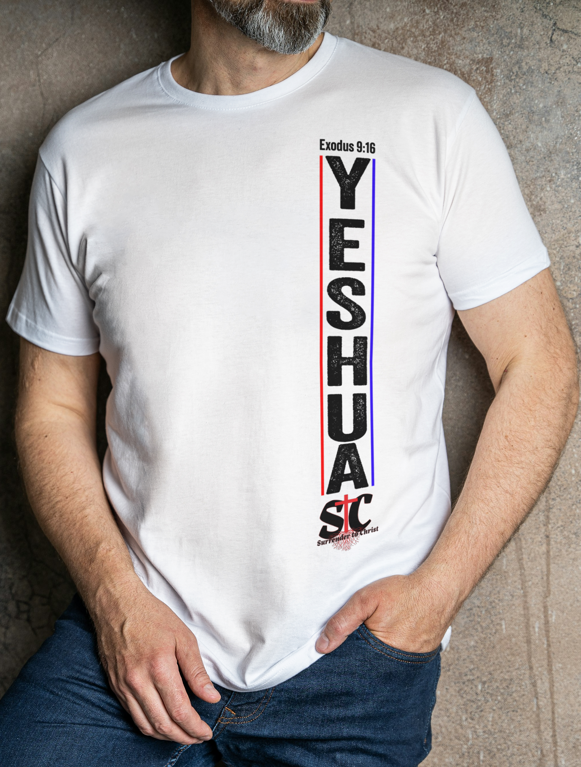 - Classic T shirt or V Neck T shirt with the word Yeshua written vertically. Exodus 9:16 on the top of Yeshua and STC logo on bottom of Yeshua. The Scripture is written out on the back.